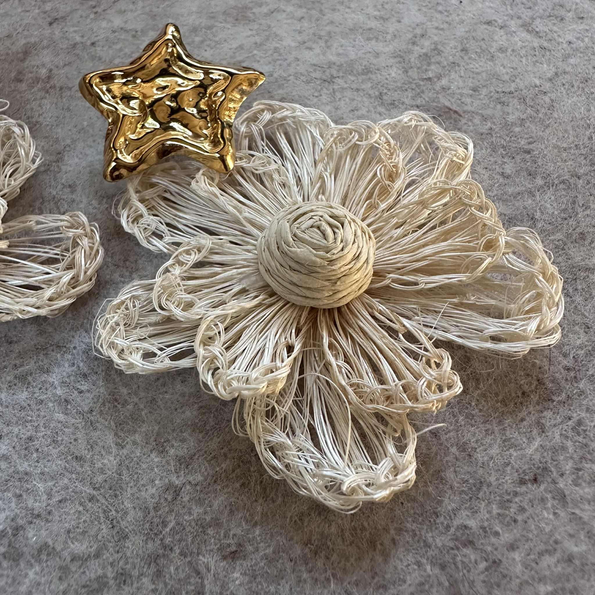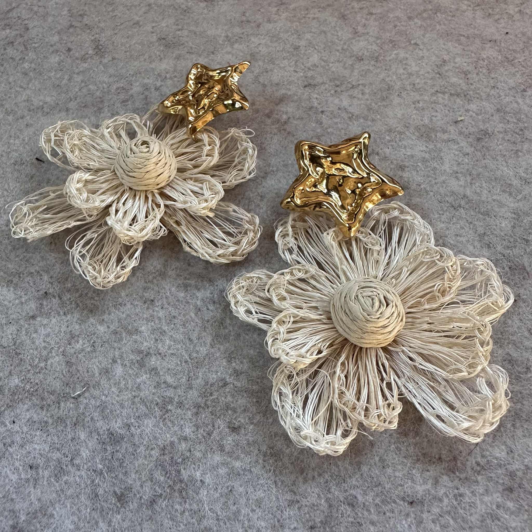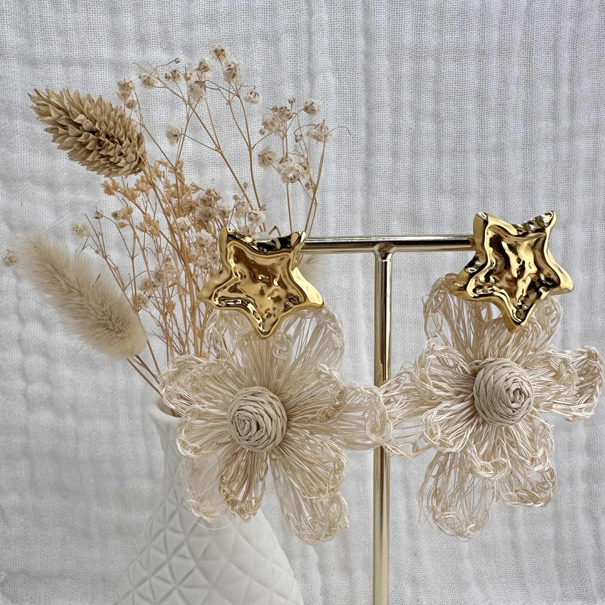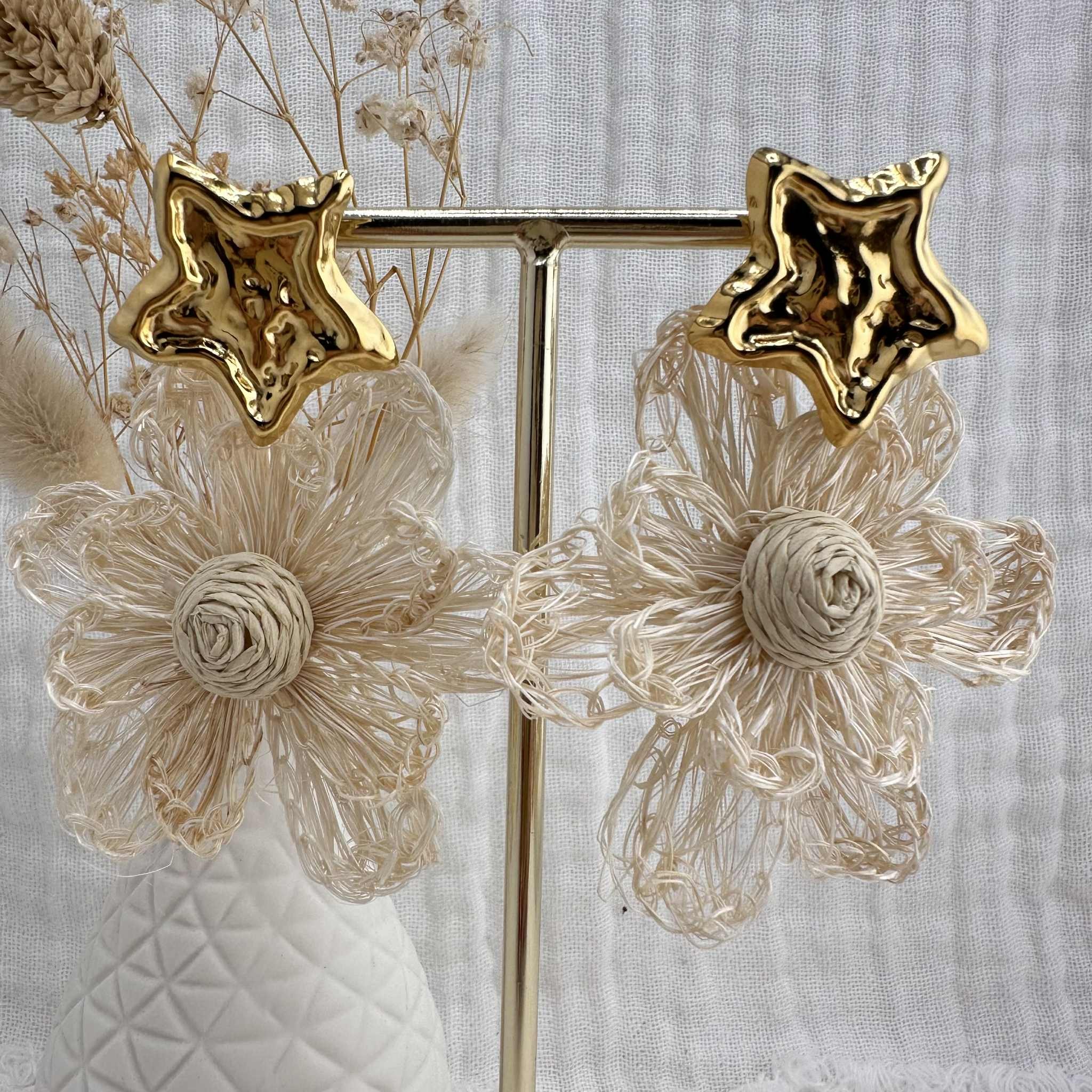 Ce sont des pendentifs fleurs en raphia écru, montés sur des clous d'oreilles étoile martelés et dorés.