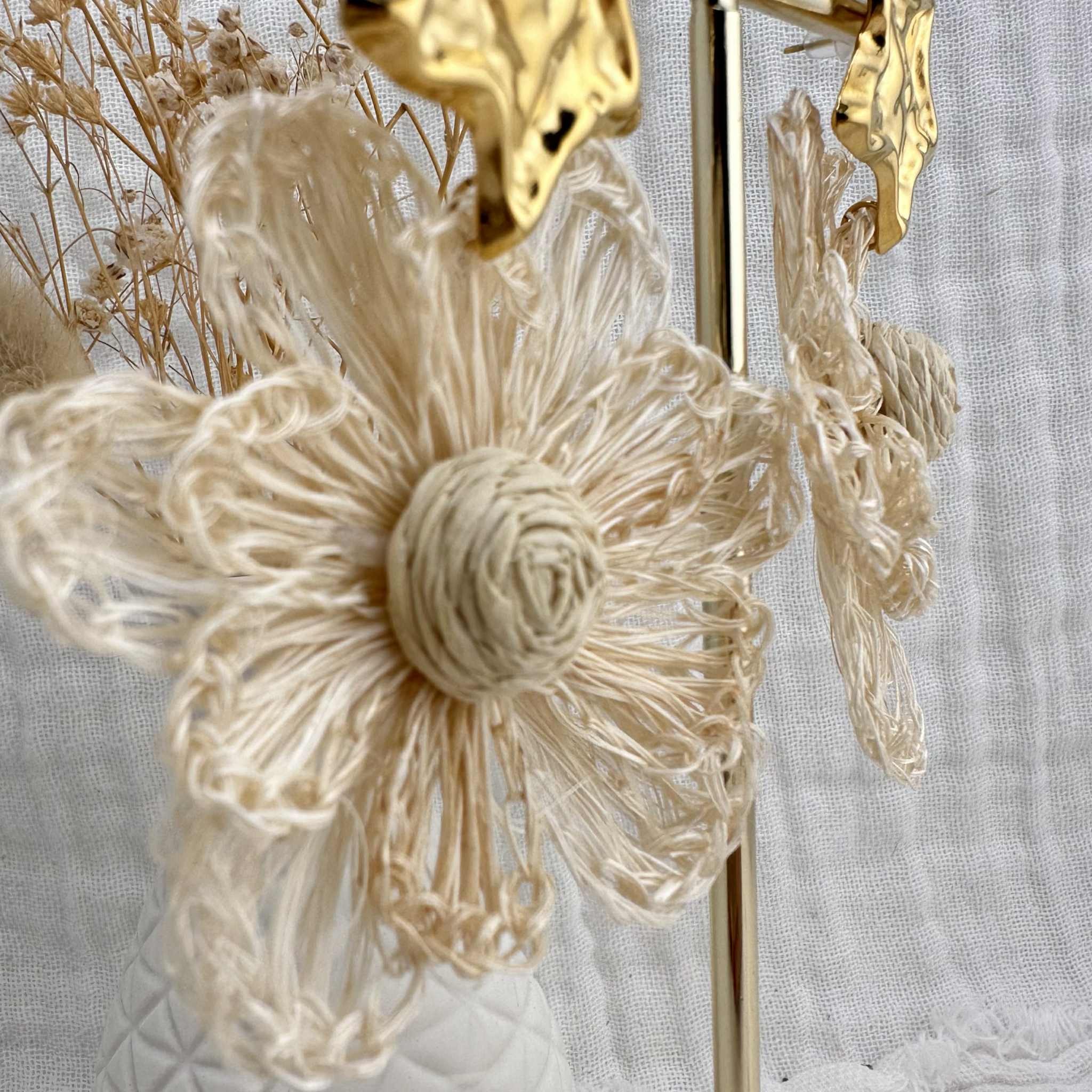fleur - idée cadeau - cadeau fille - cadeau femme - boucle d'oreille nature - création - saint-valentin - cadeau - idée cadeau fille - cadeau anniversaire - bijou imposant - bijoux fantaisie - bijoux original - bijoux qui brillent - parure bijoux - fleur raphia - bijoux écru - étoile dorée - bijoux tendance - bijou cadeau - bijou chic - bijou fait main - atelier Bordeaux - créatrice bijoux - bijou bordeaux