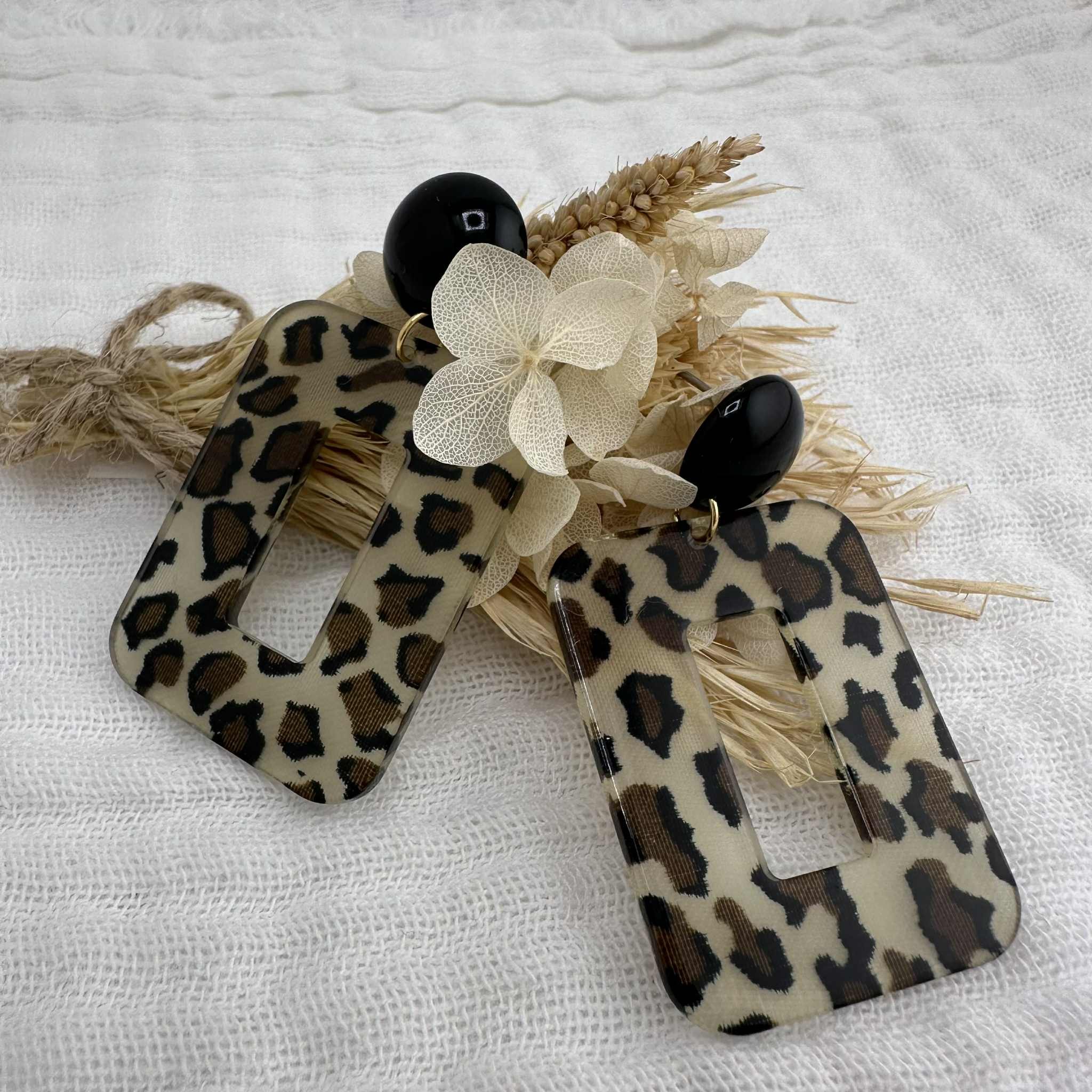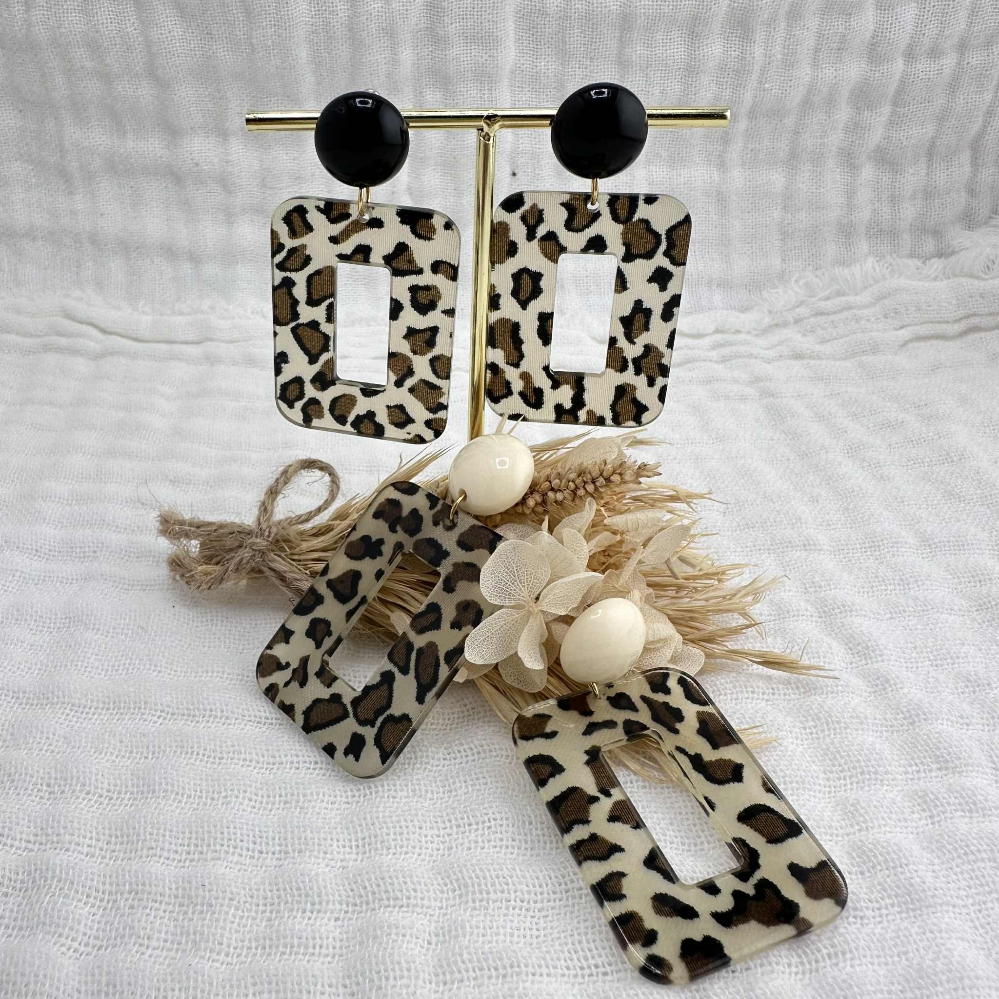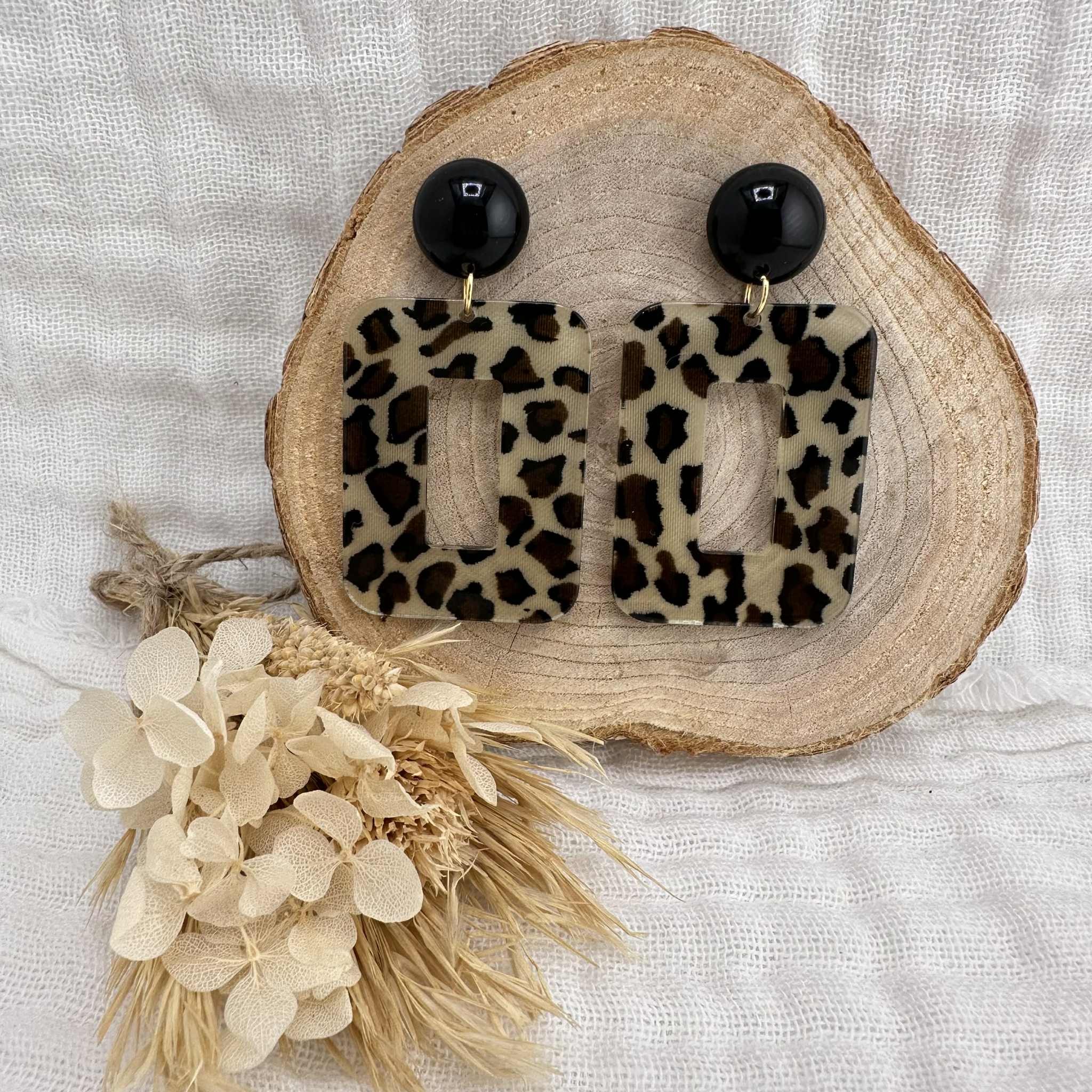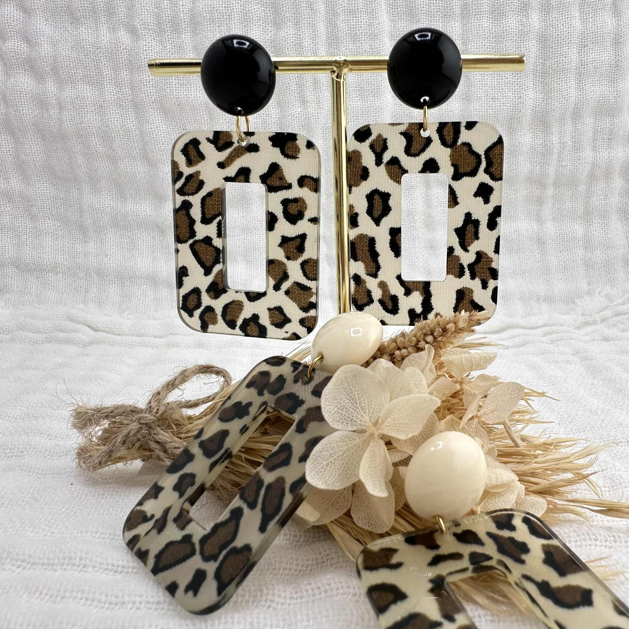 Ce sont des pendentifs rectangulaires évidés au motif léopard, montés sur des clous d'oreilles ronds noir ou crème.