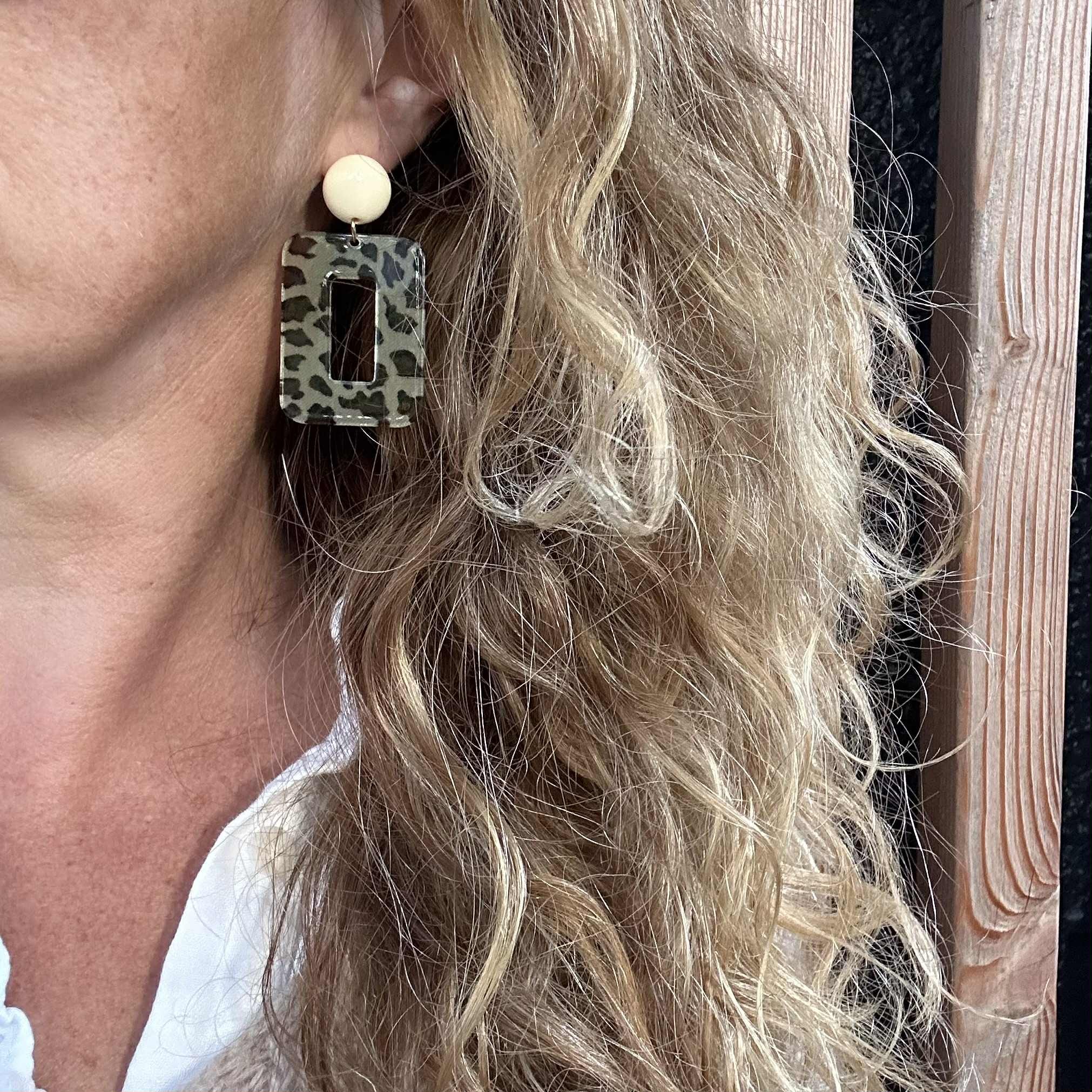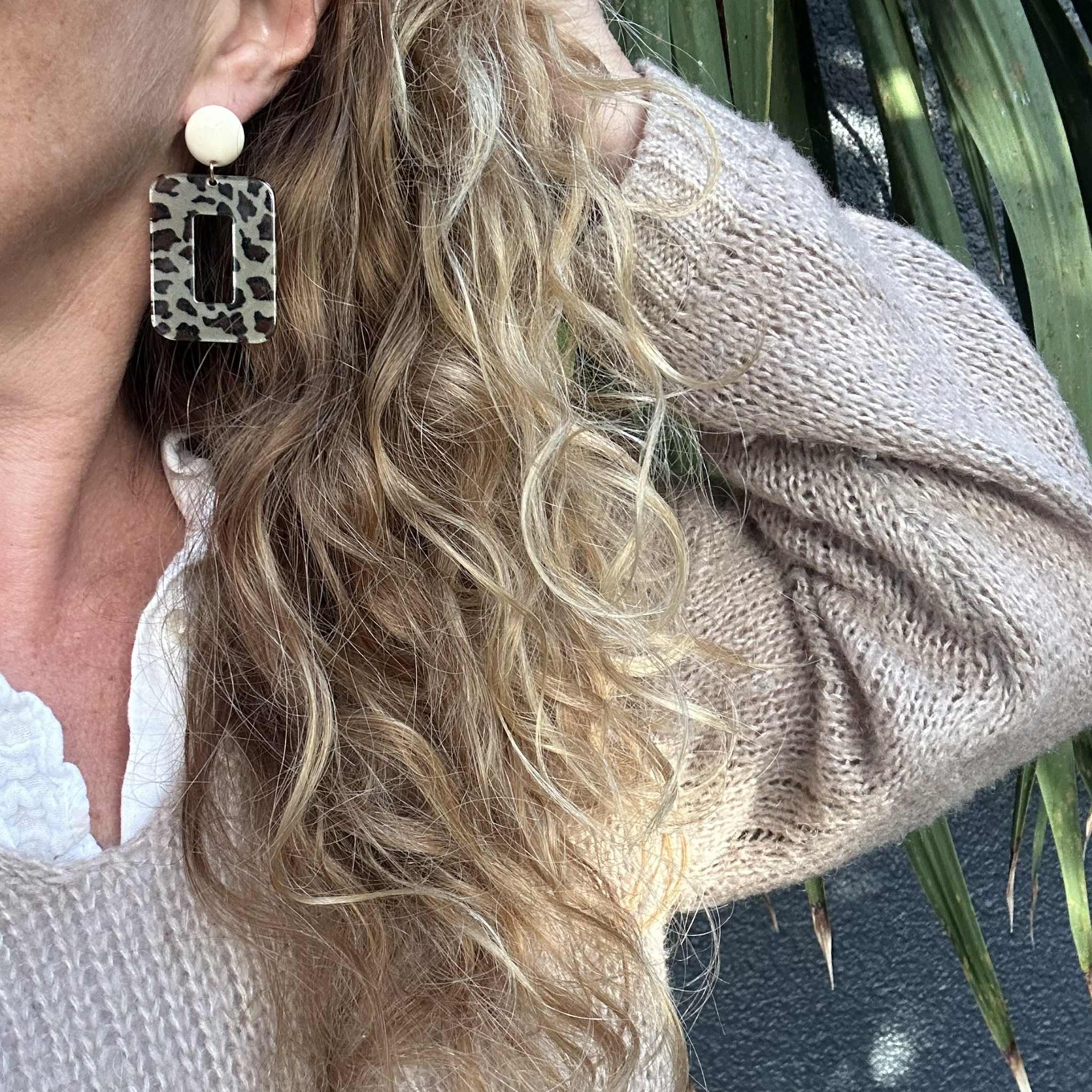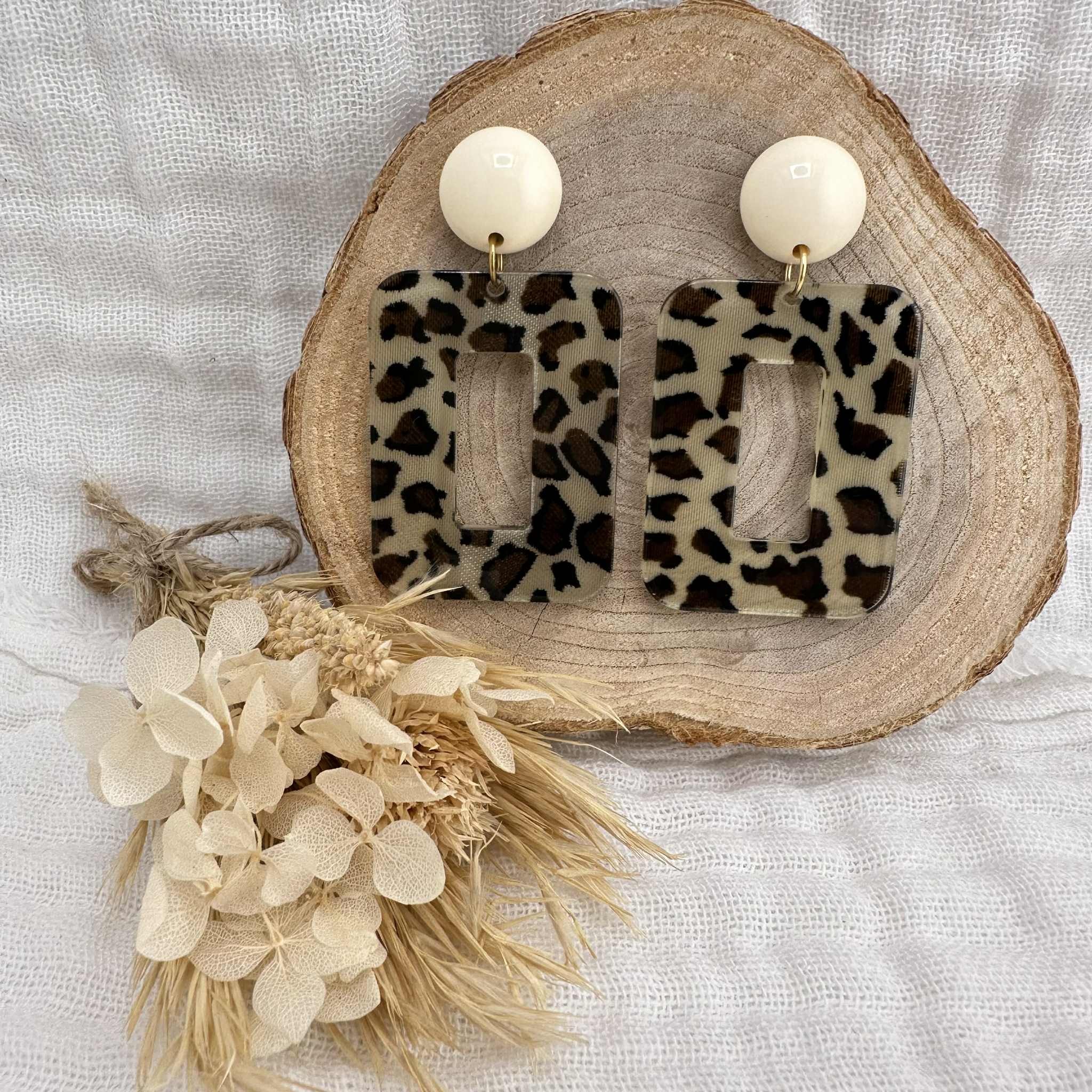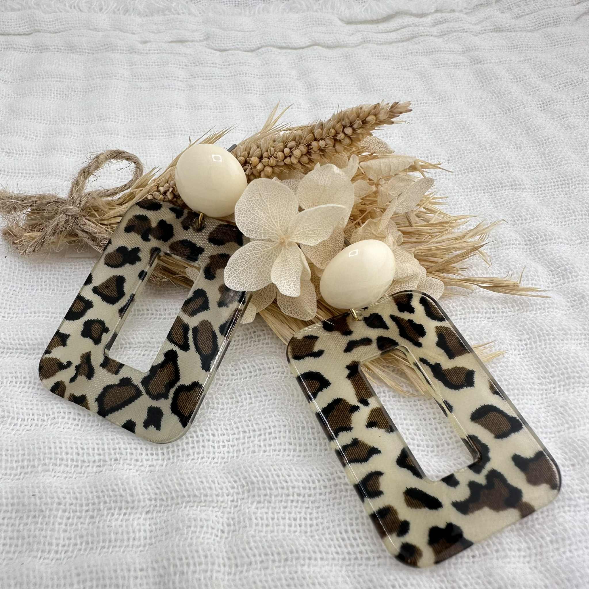 Ce sont des pendentifs rectangulaires évidés au motif léopard, montés sur des clous d'oreilles ronds noir ou crème.