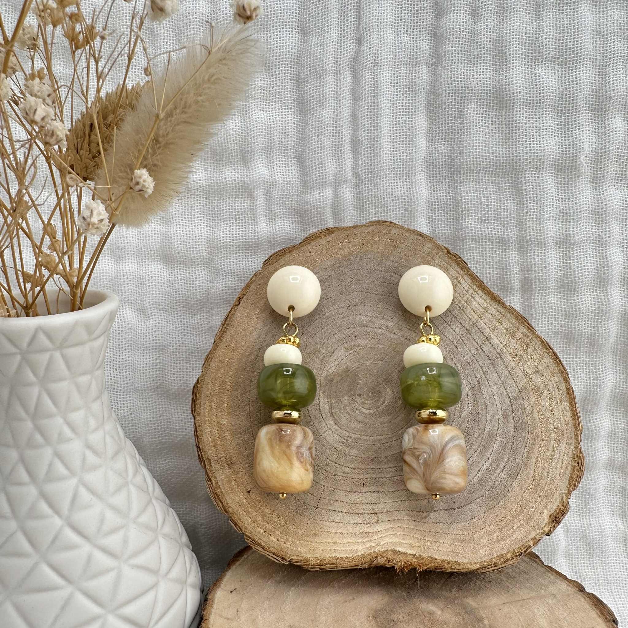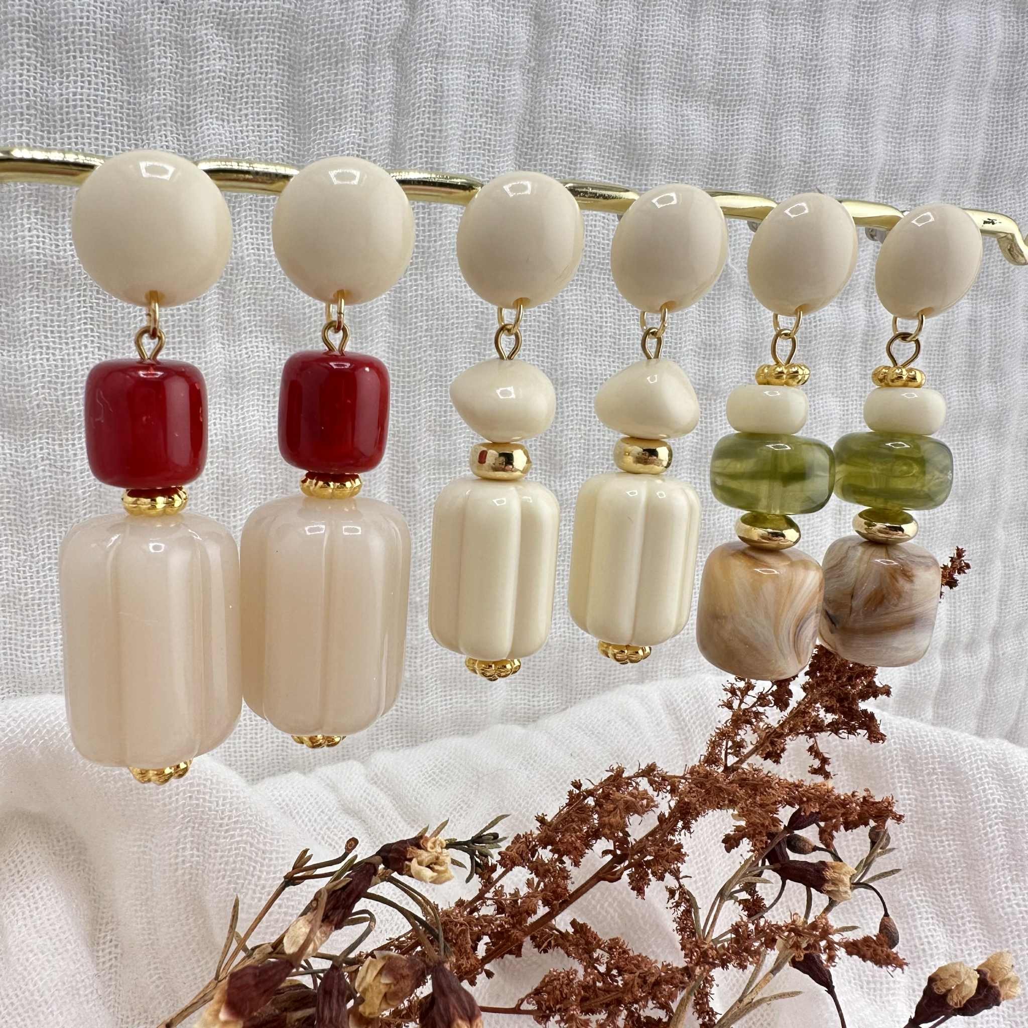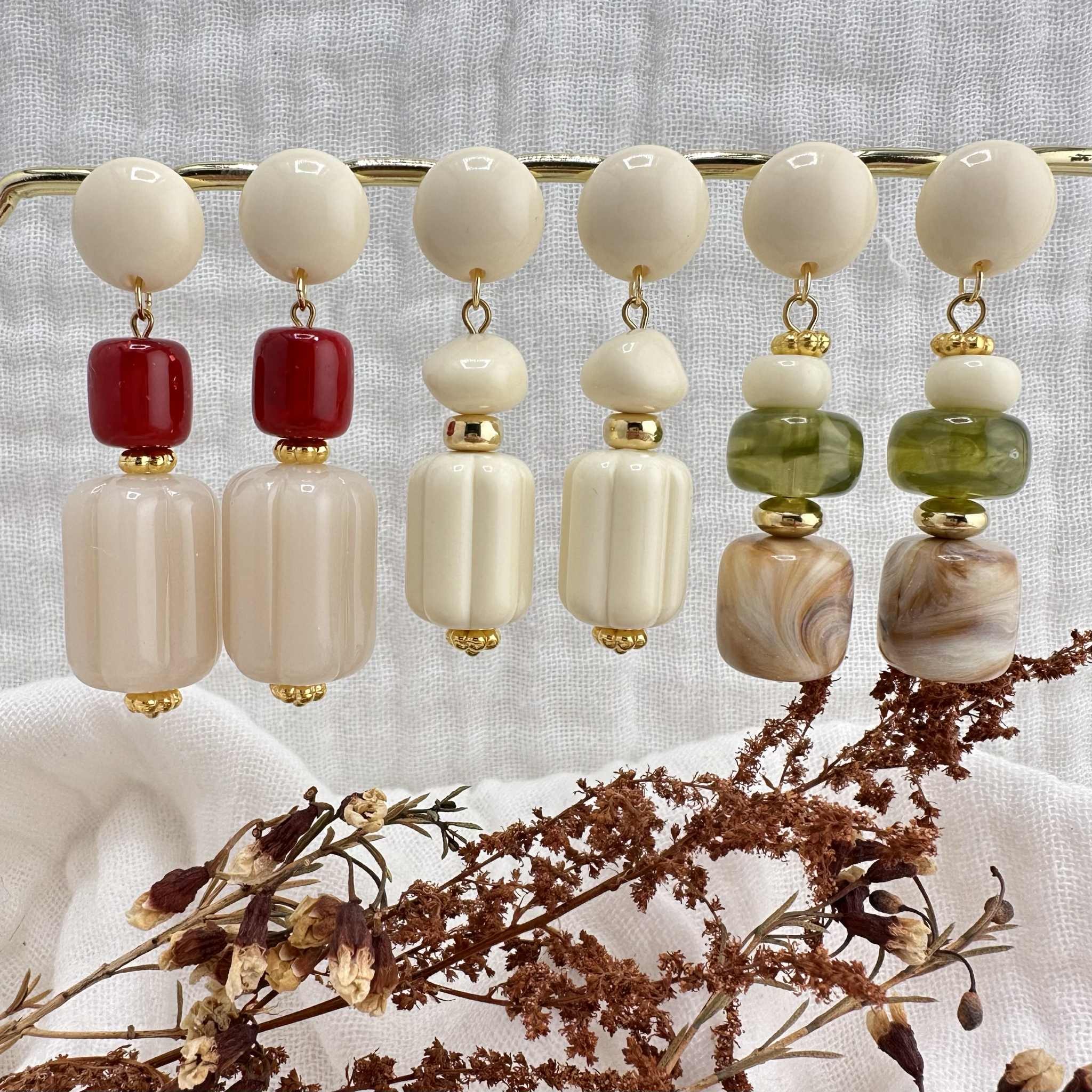 Ce sont des pendentifs composés de différentes perles en résine, montés sur des clous d'oreilles ronds assortis.