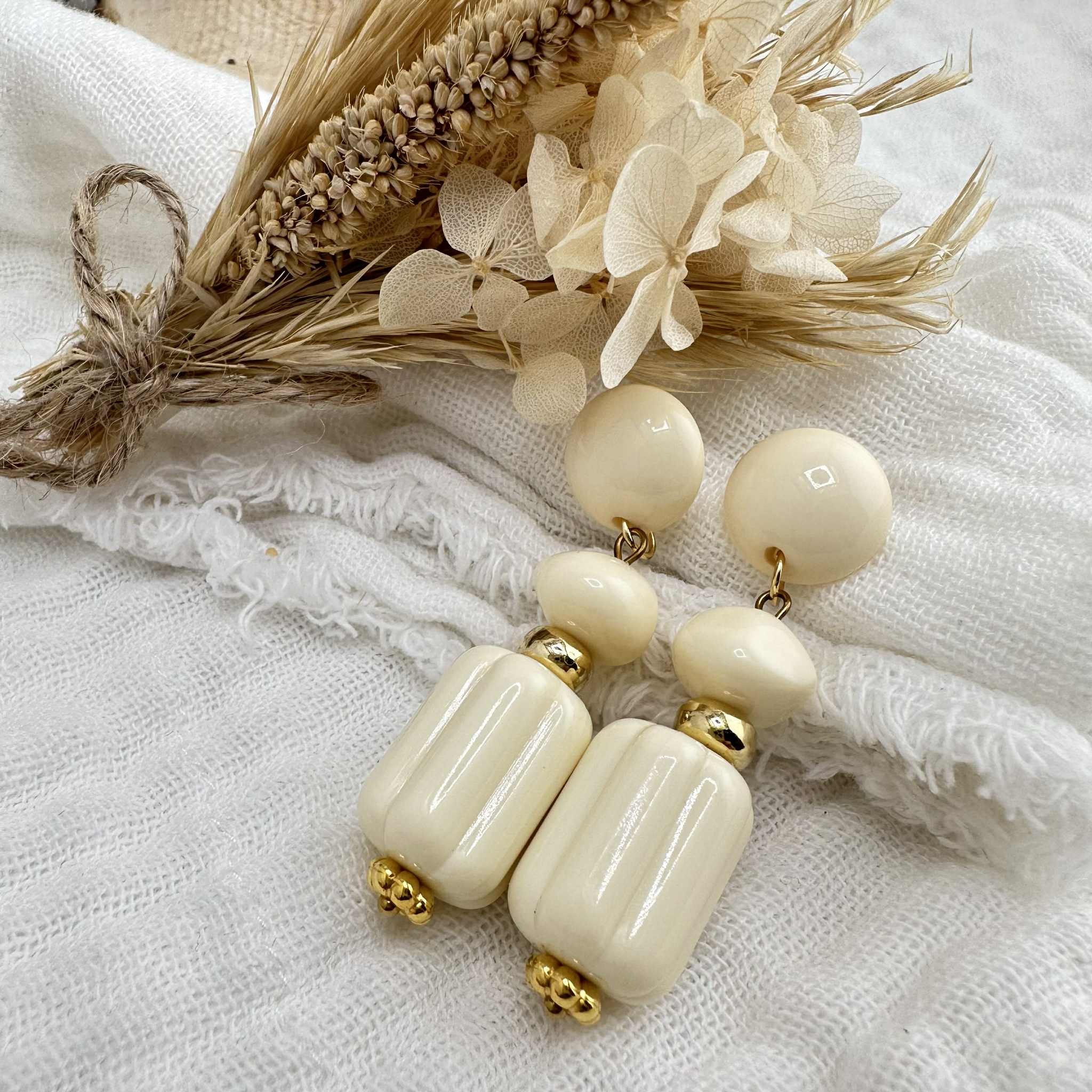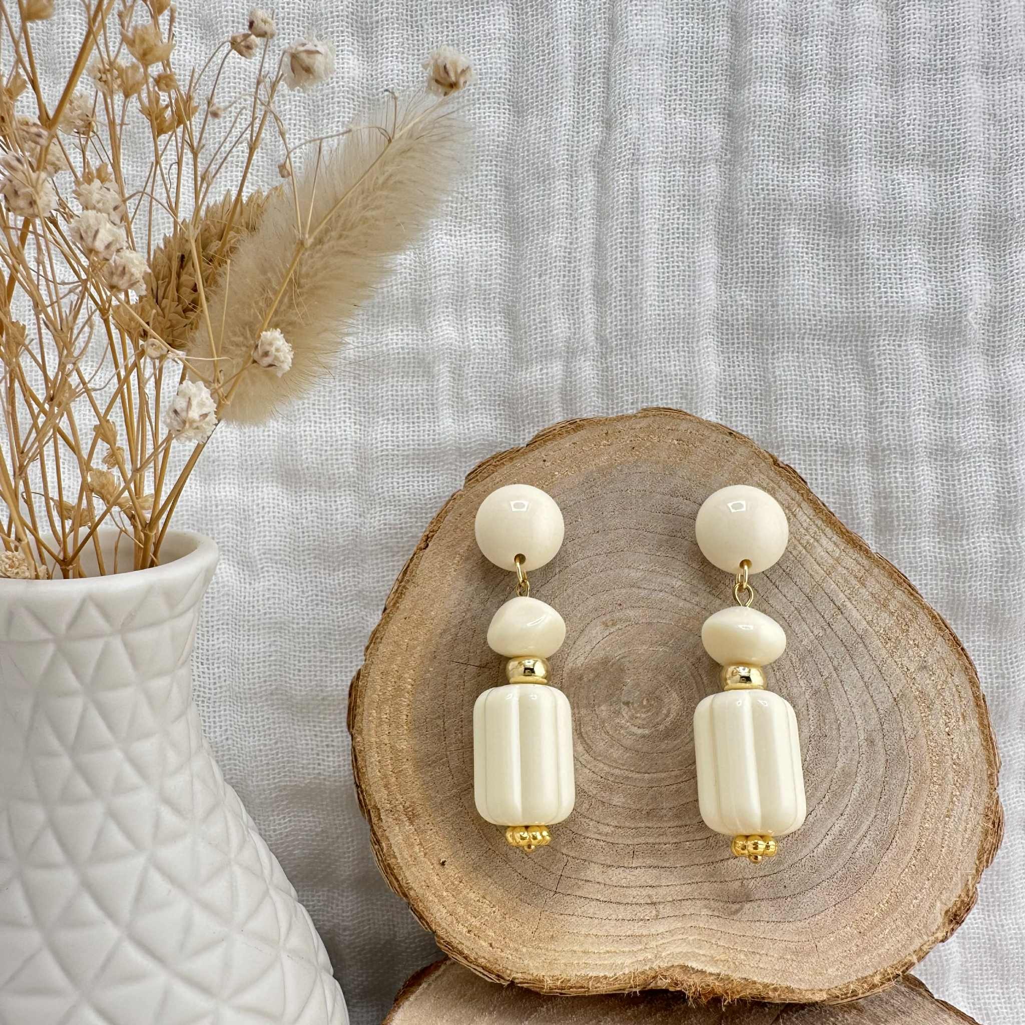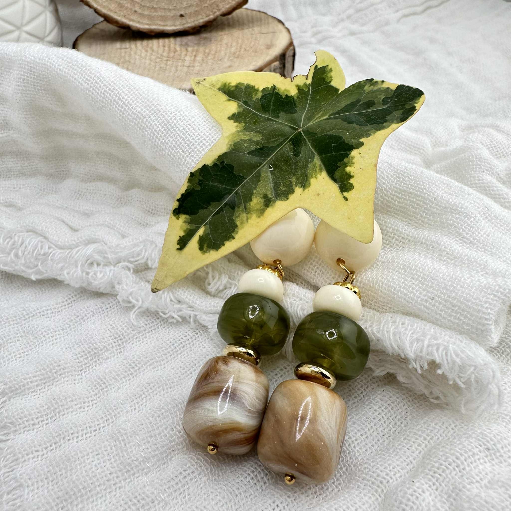 Ce sont des pendentifs composés de différentes perles en résine, montés sur des clous d'oreilles ronds assortis.