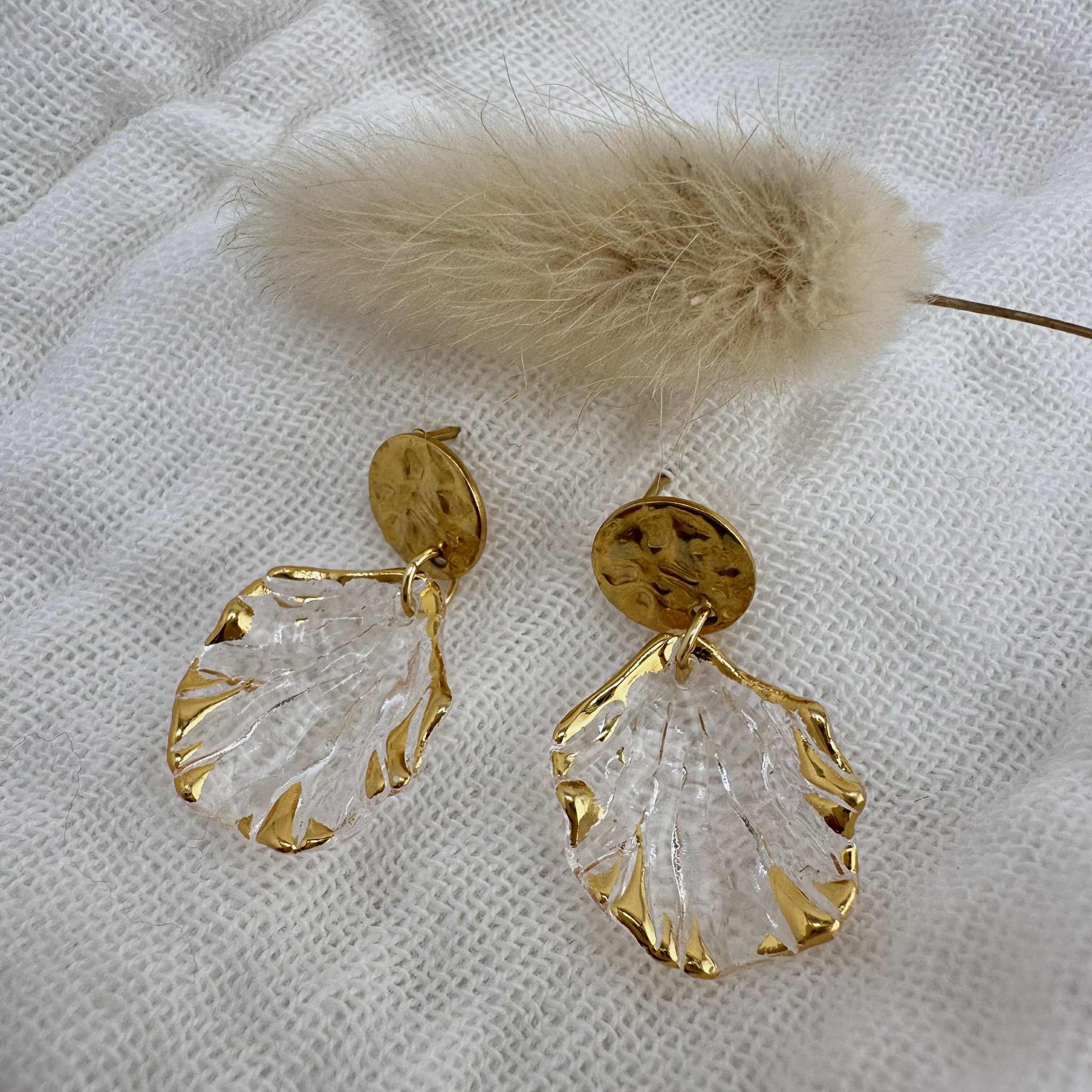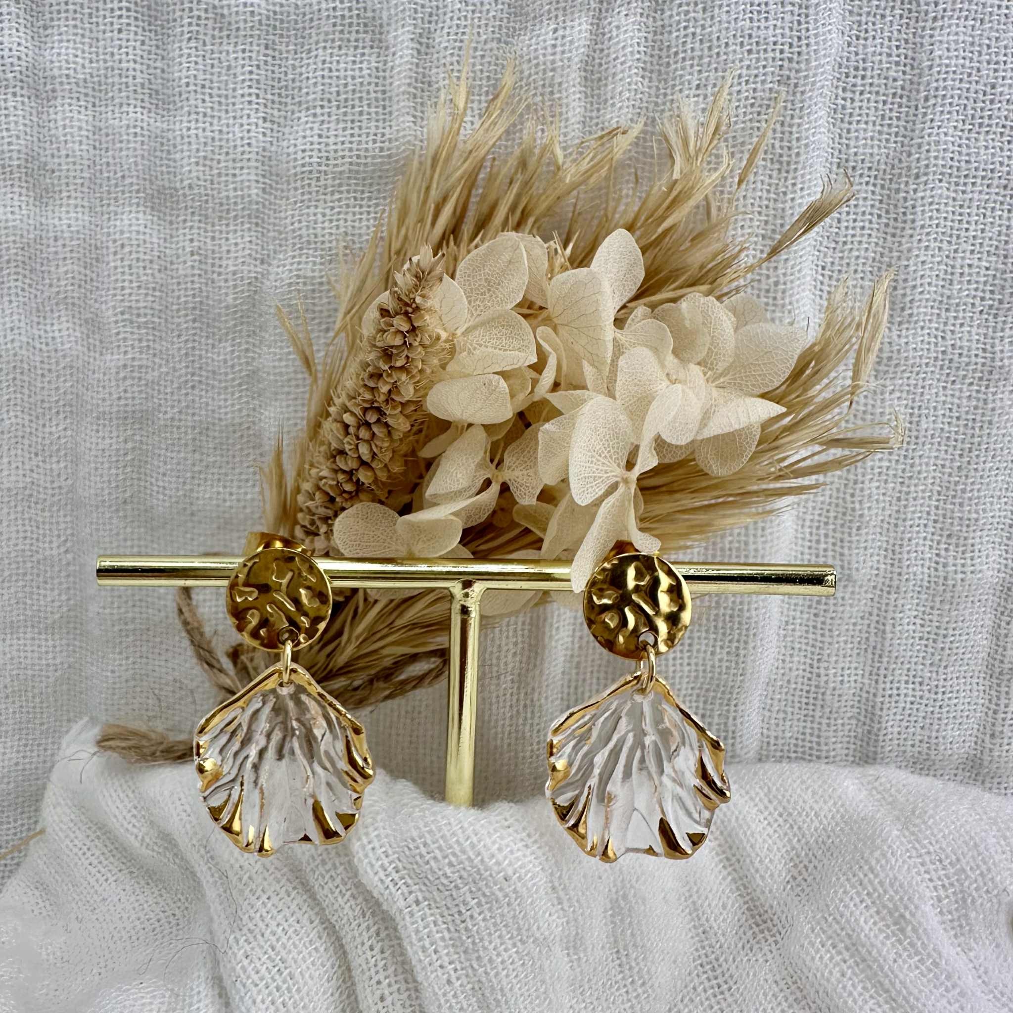 Ce sont de petits pendentifs en forme de pétales transparents et dorés, montés sur des clous d'oreilles ronds martelés.