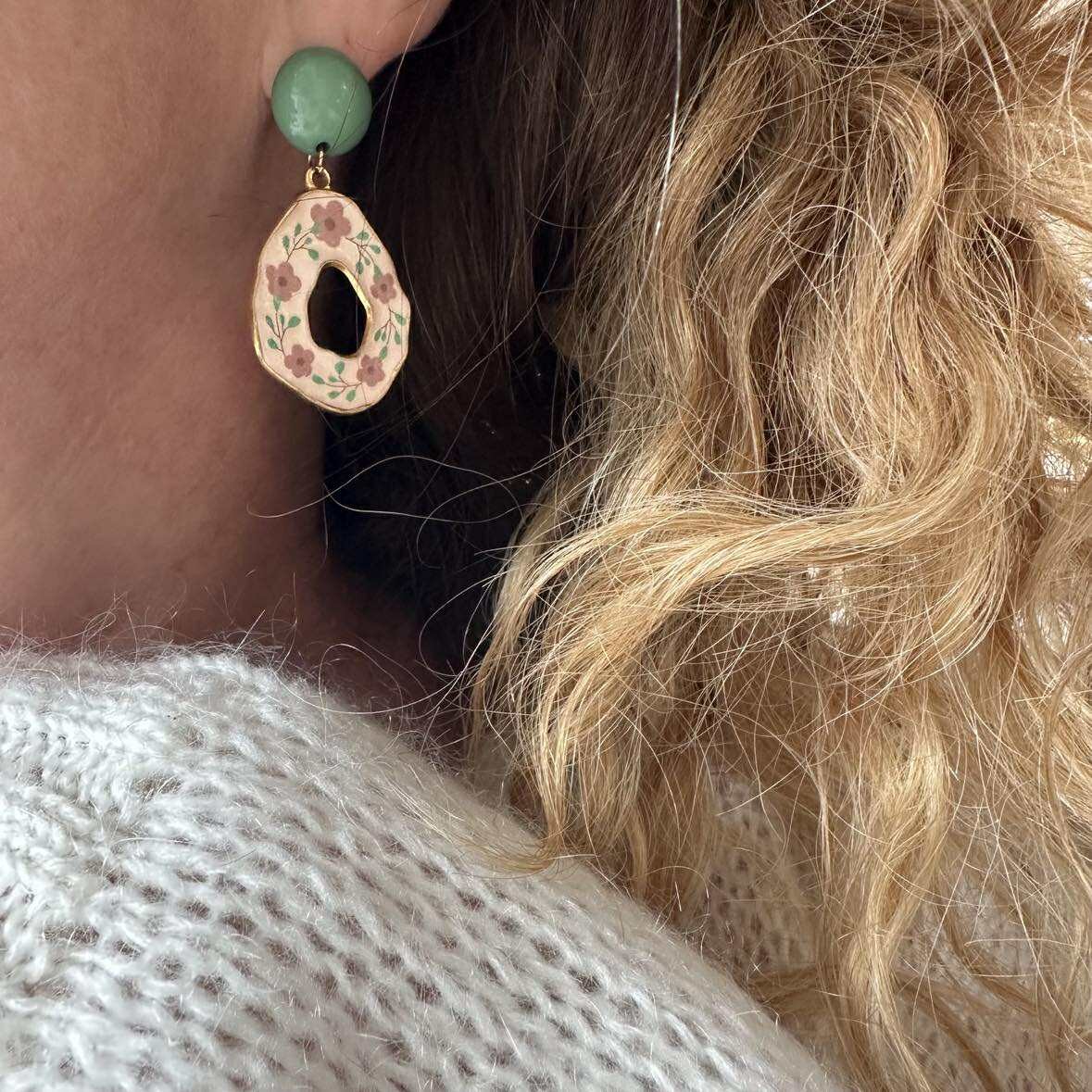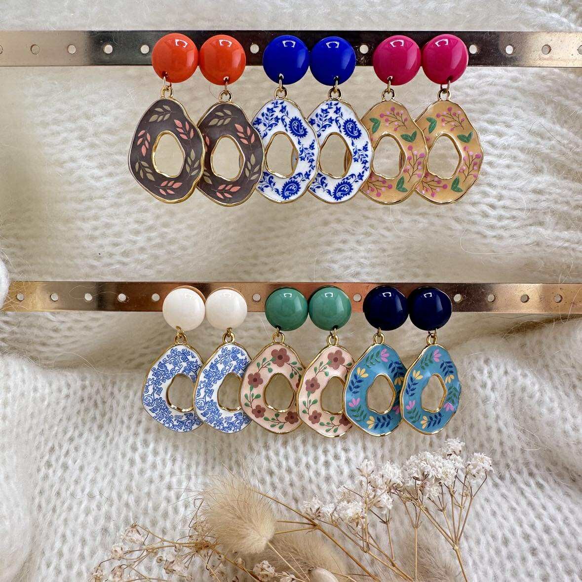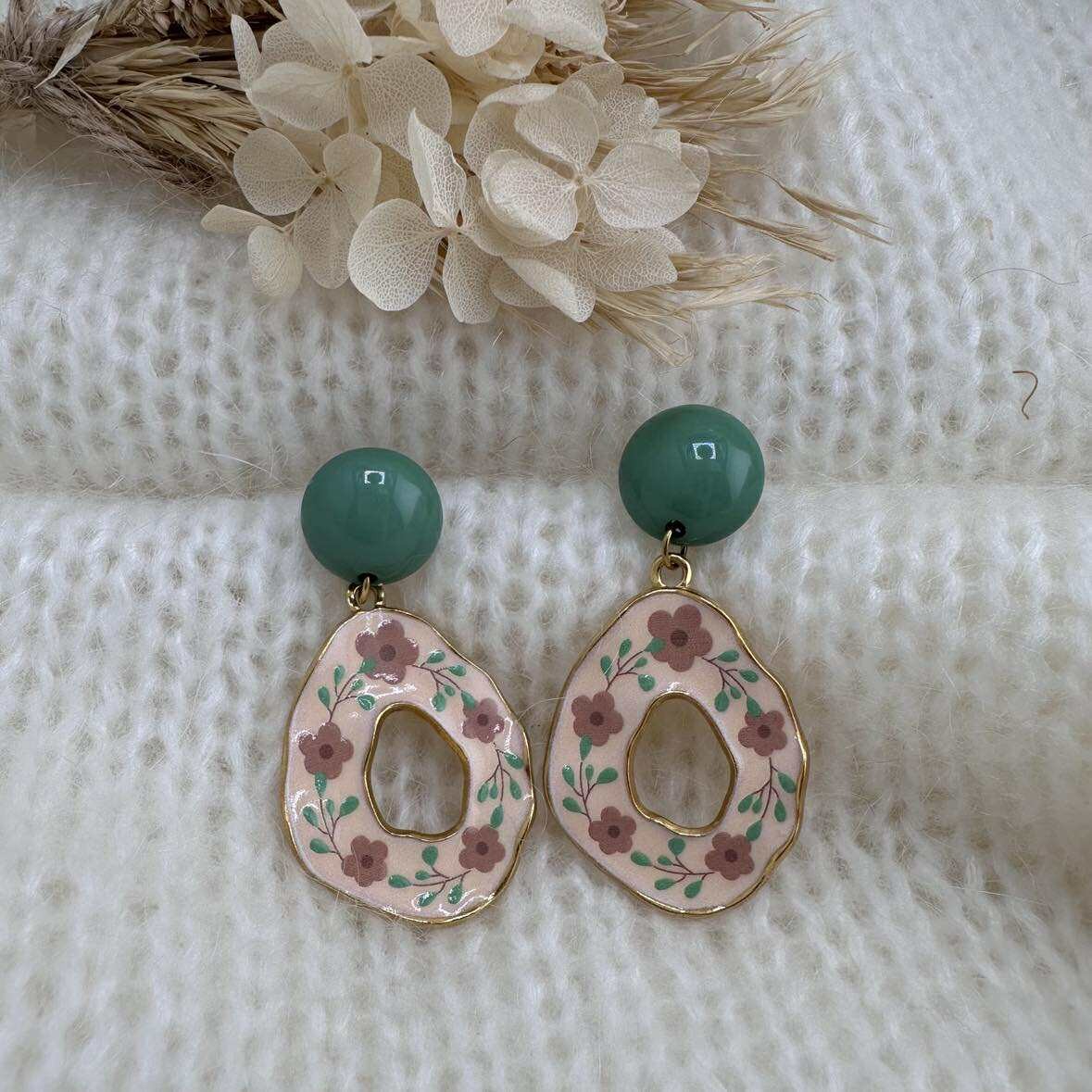 Ce sont des pendentifs gouttes aux motifs floraux, montés sur des clous d'oreilles ronds assortis.