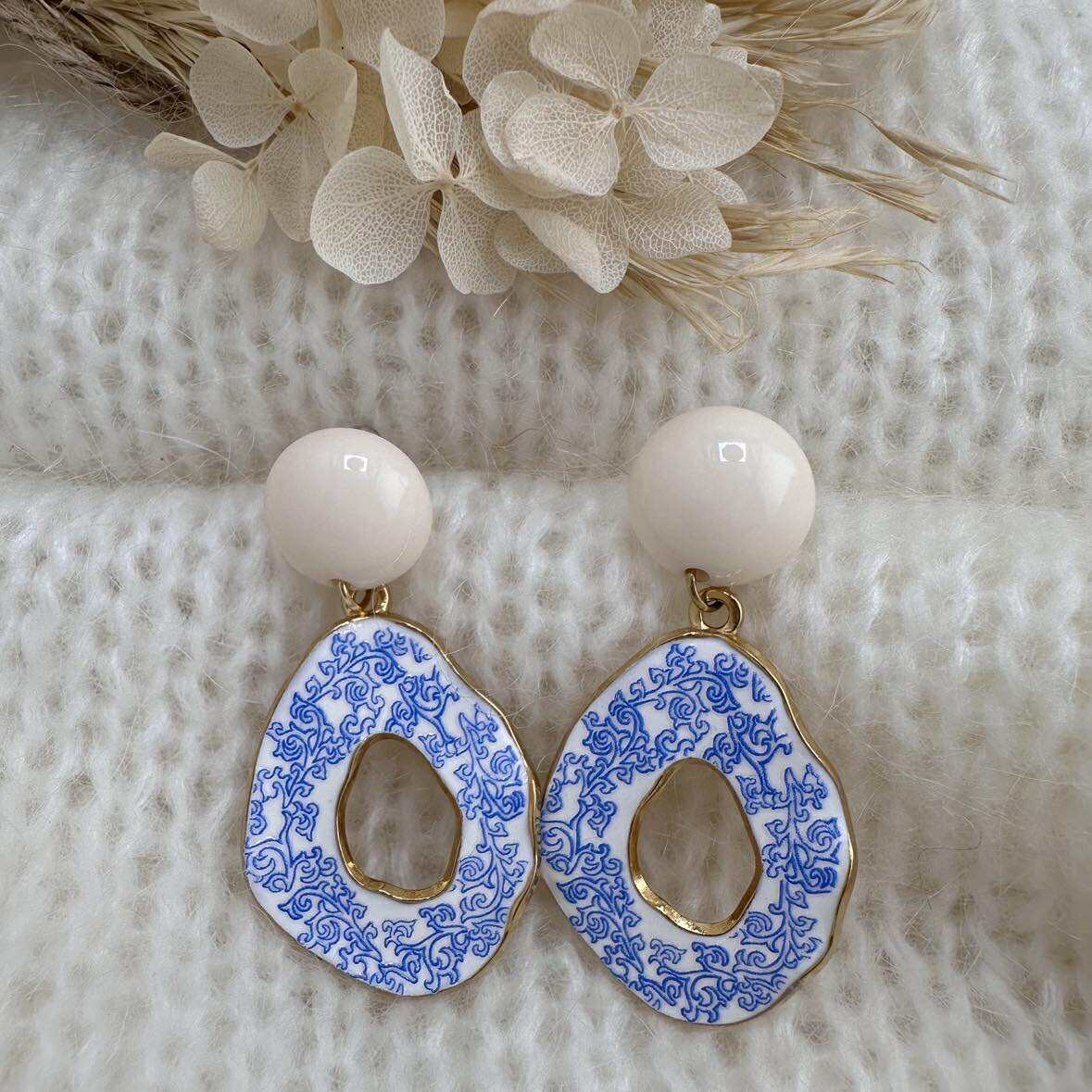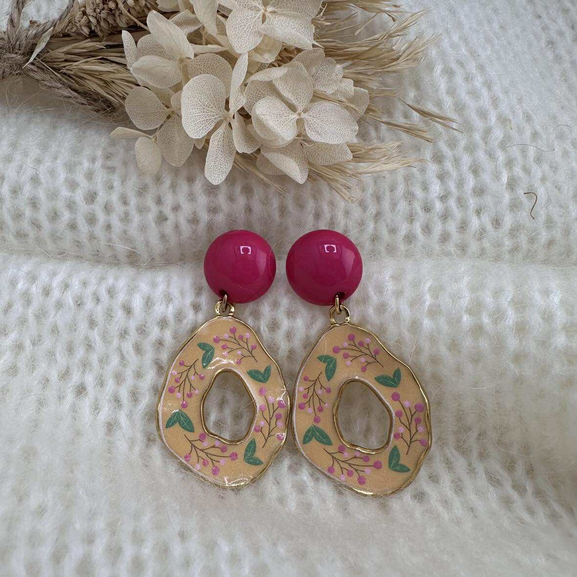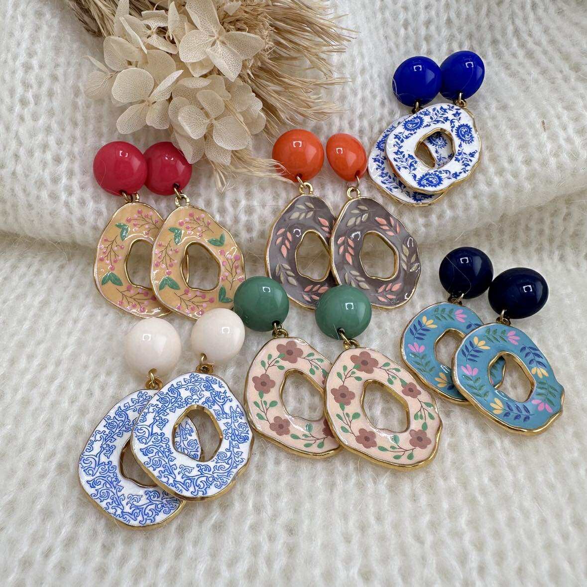 Ce sont des pendentifs gouttes aux motifs floraux, montés sur des clous d'oreilles ronds assortis.