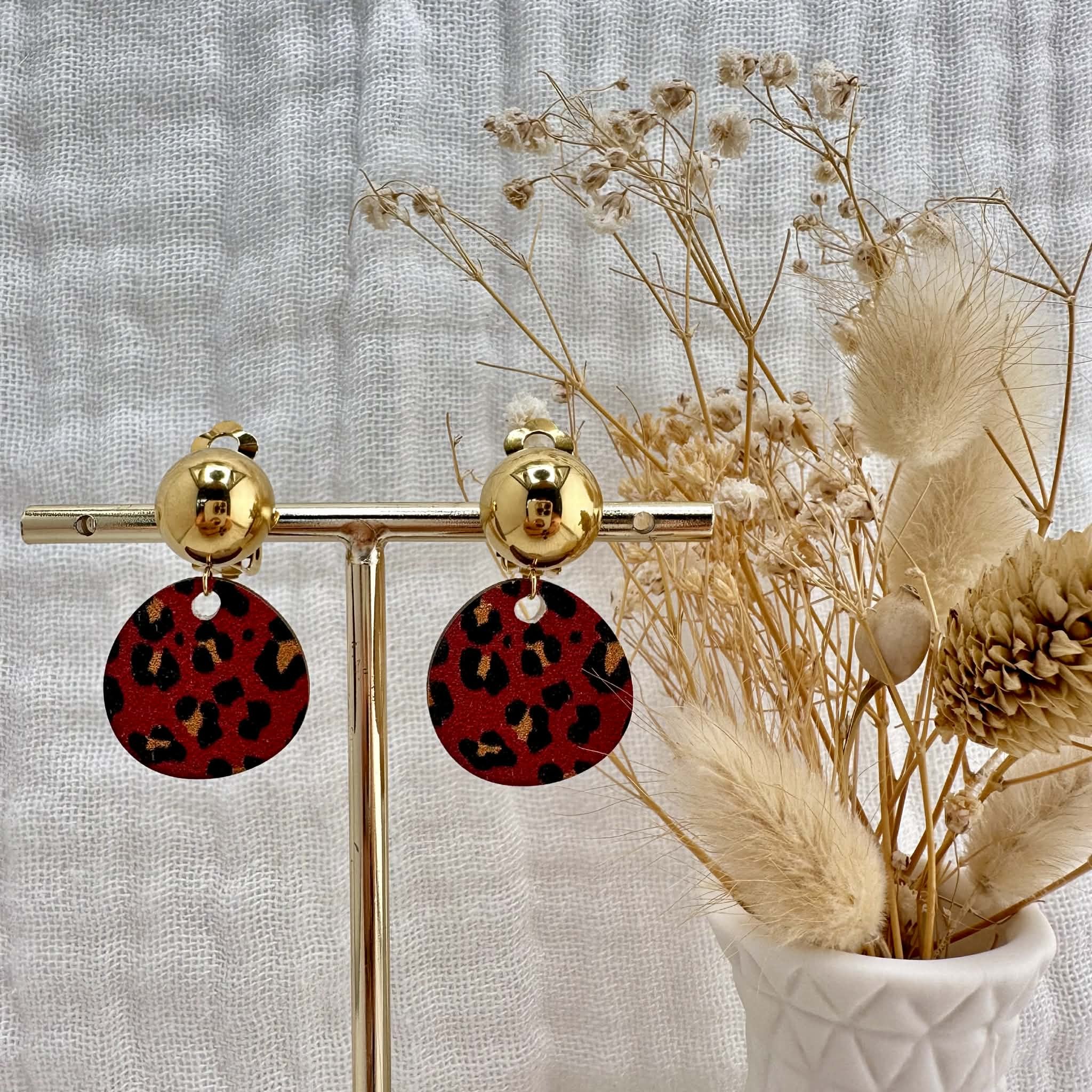 Ce sont de légers pendentifs en bois imprimés léopard de couleur rouge bordeaux, montés sur des clous d'oreilles clips bombés dorés.