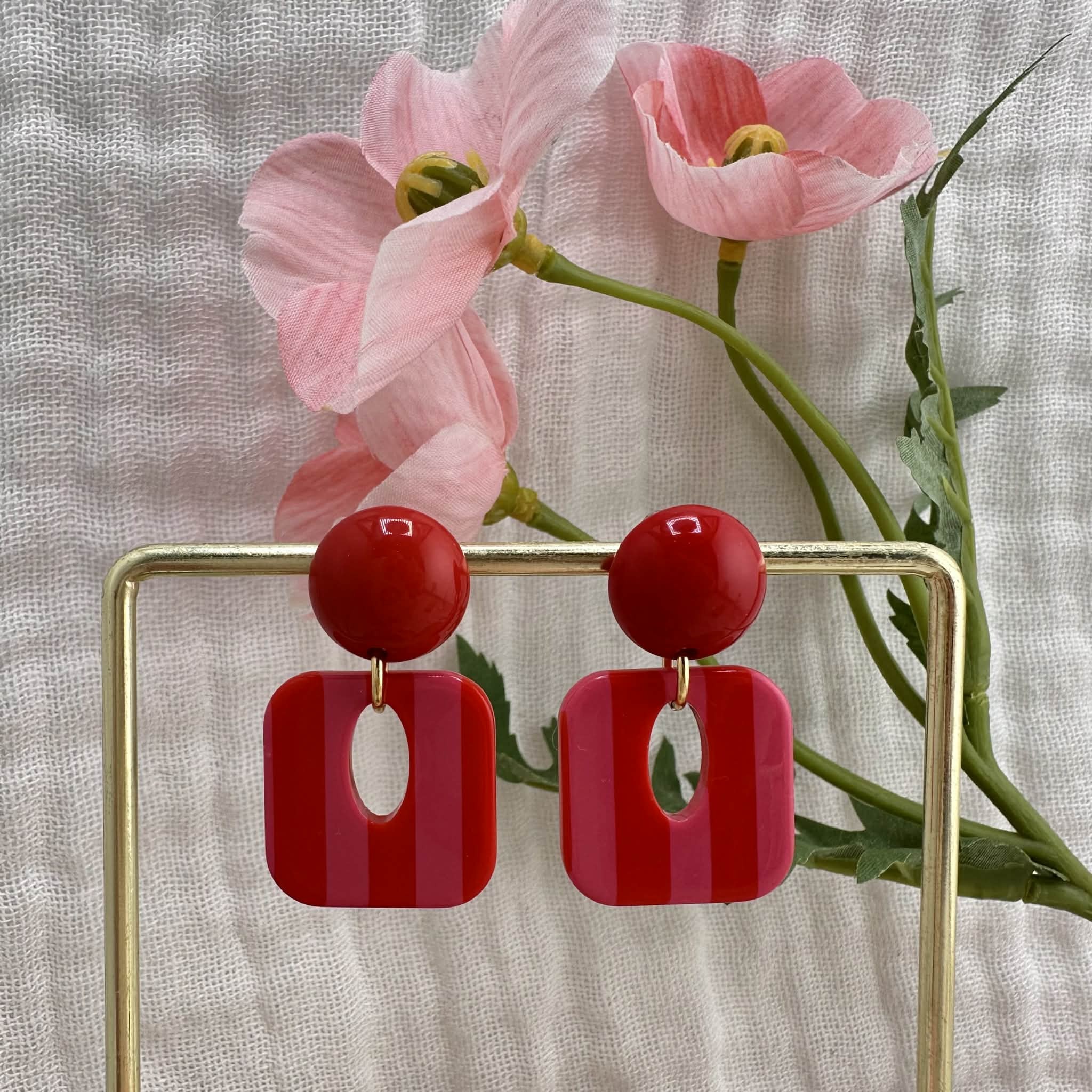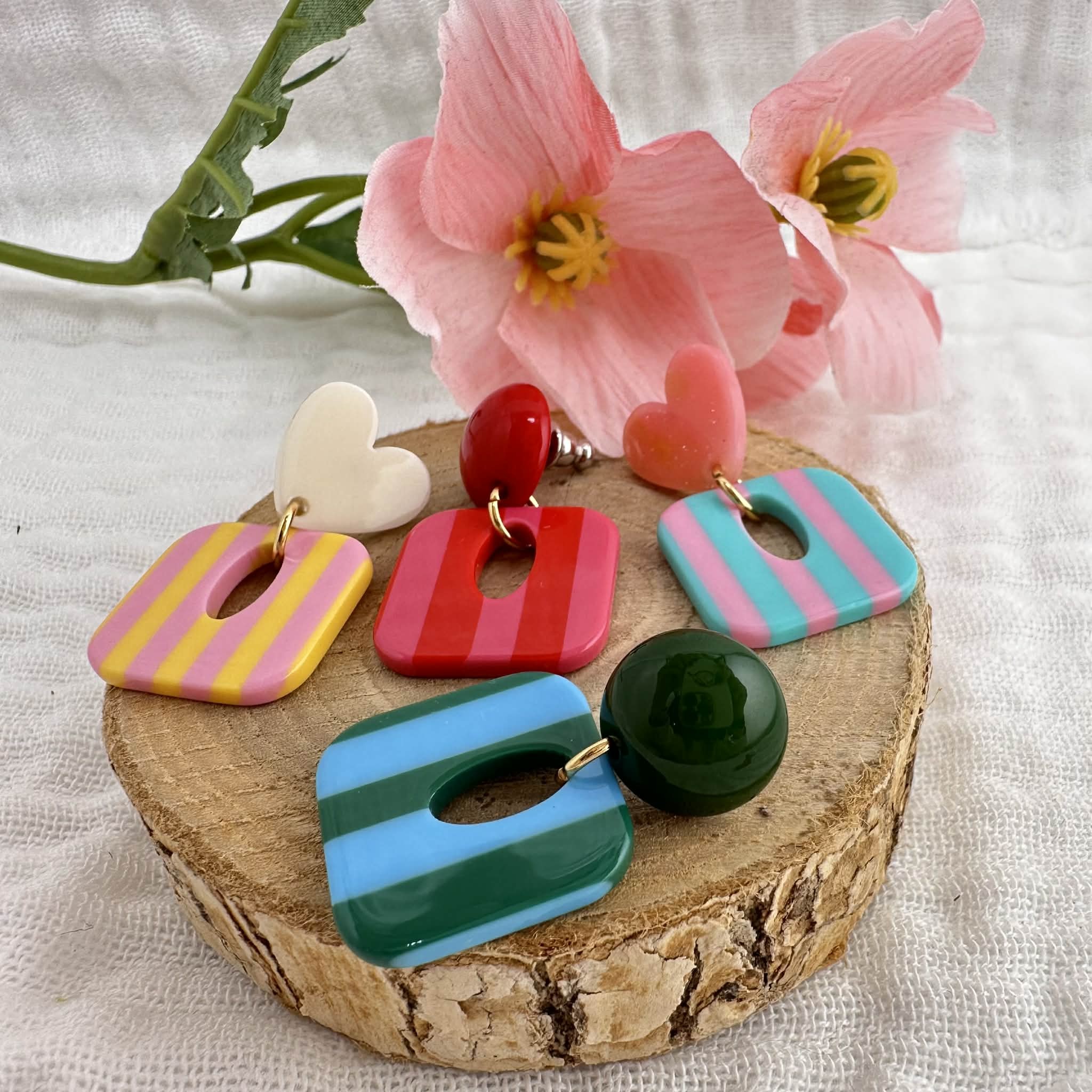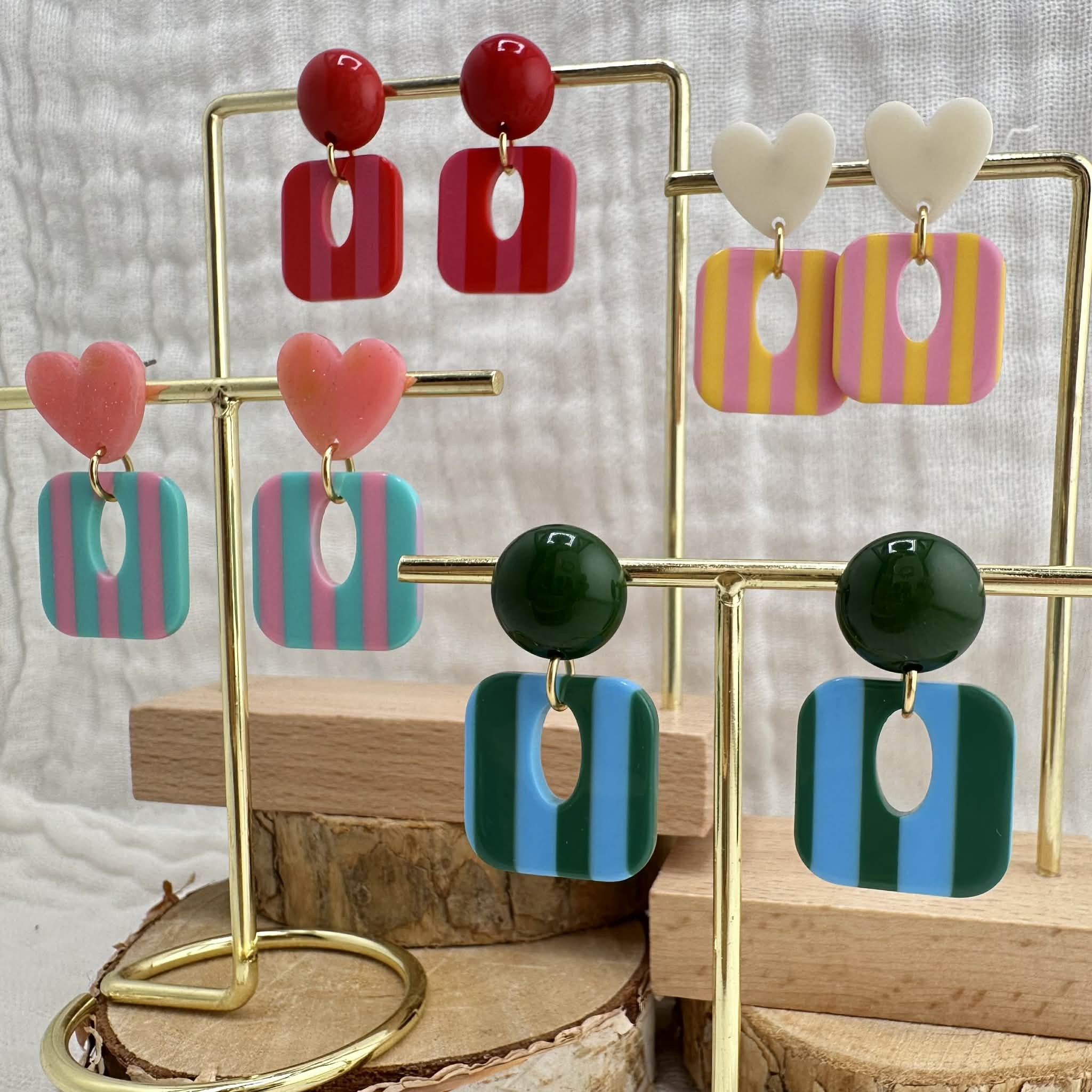 Ce sont des pendentifs carrés, colorés et rayés, montés sur des clous d'oreilles ronds ou coeurs assortis.
