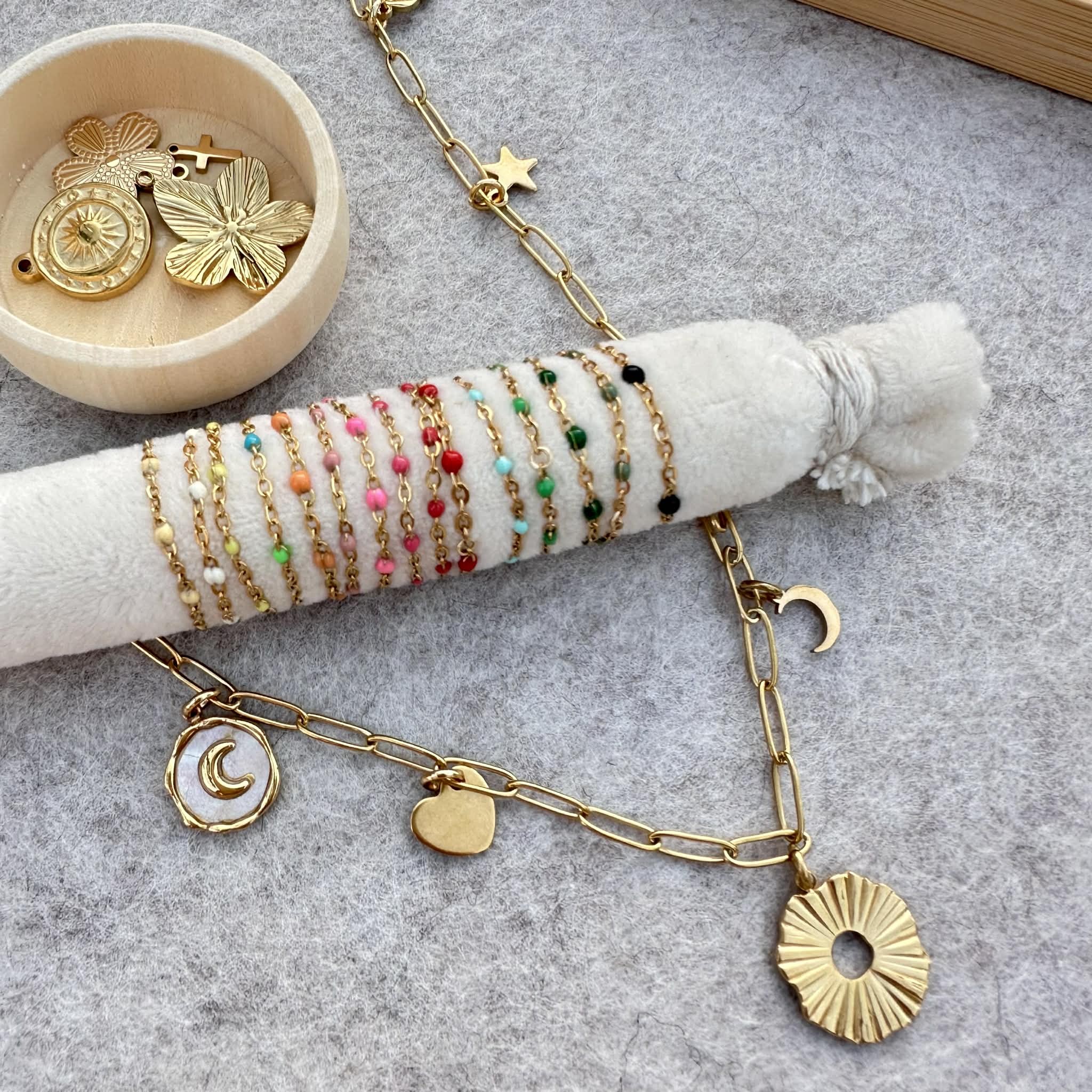 1 sautoir : chaîne en acier inoxydable doré (80cm maximum), 9 pampilles (charms) en acier inoxydable doré, en nacre, en verre et en céramique, de ton choix.
