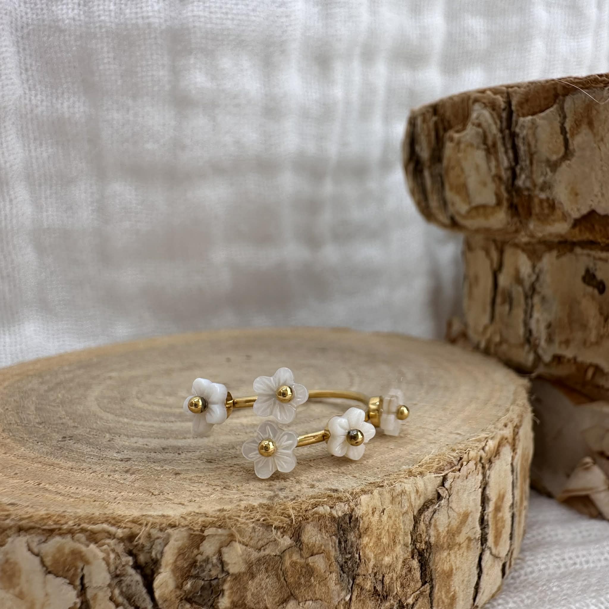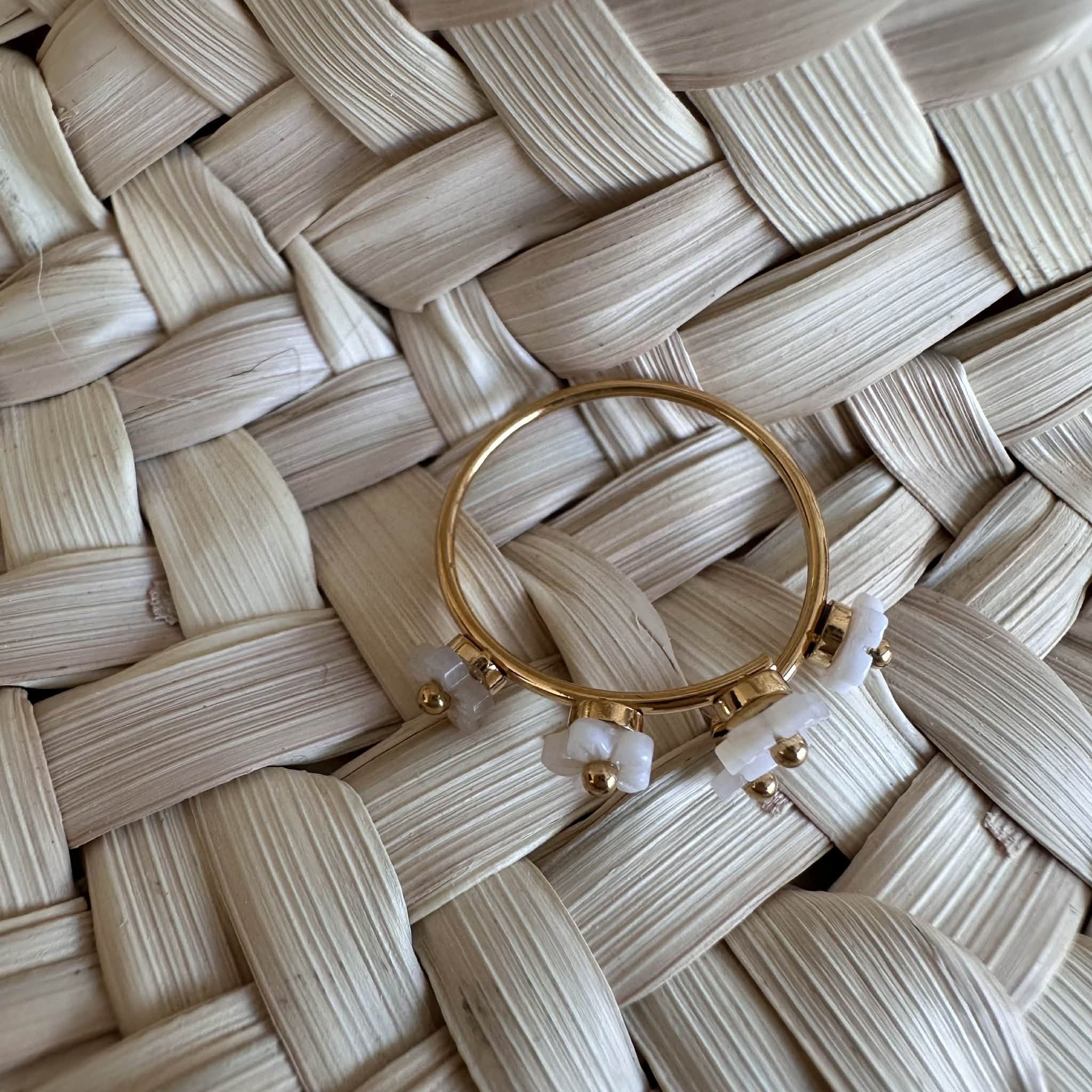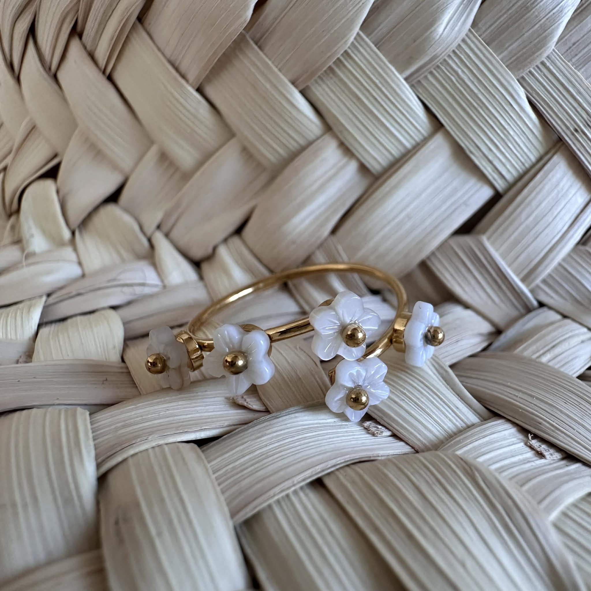 Une jolie bague délicate en acier inoxydable doré, décorée de petites fleurs en nacre, ajustable.