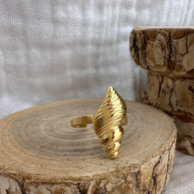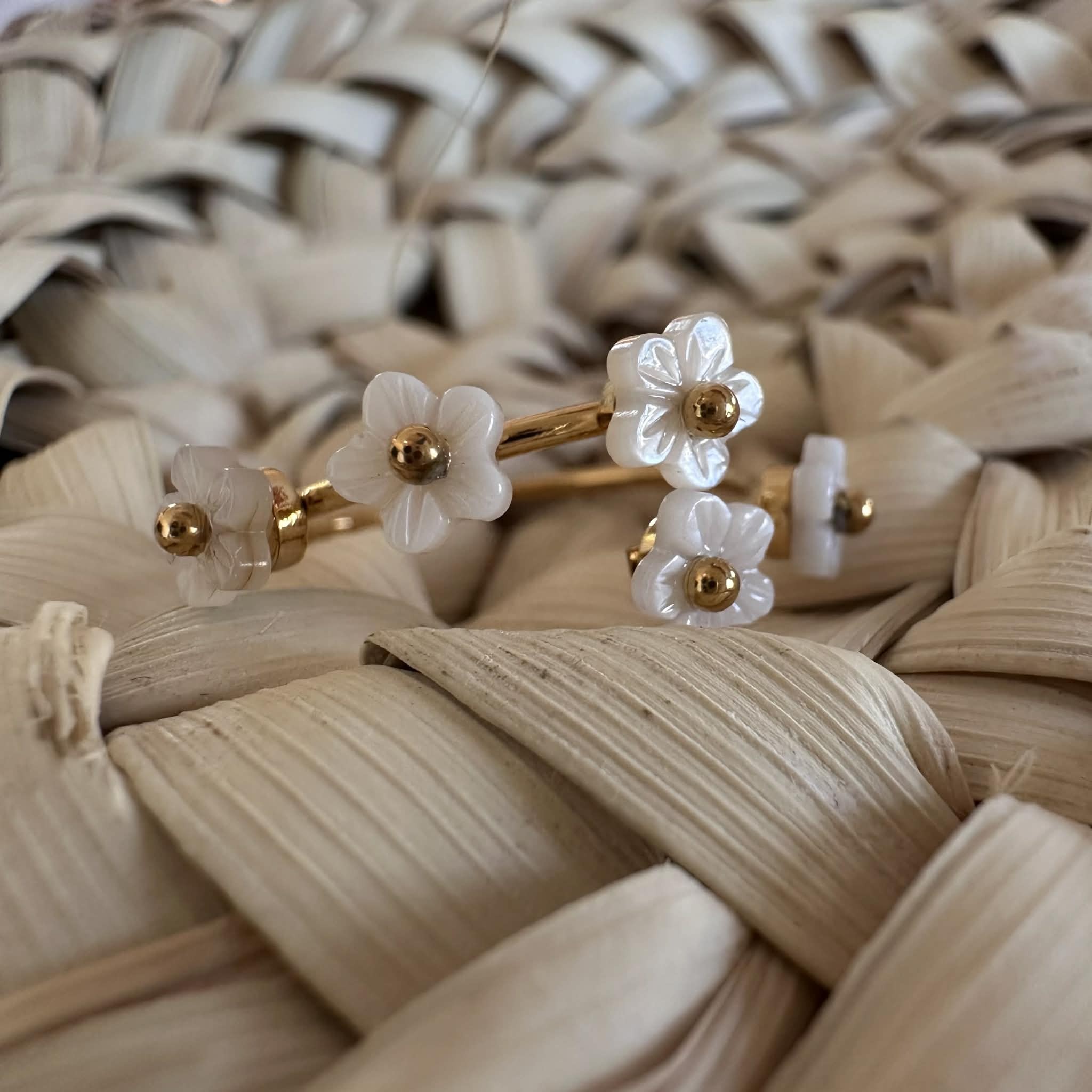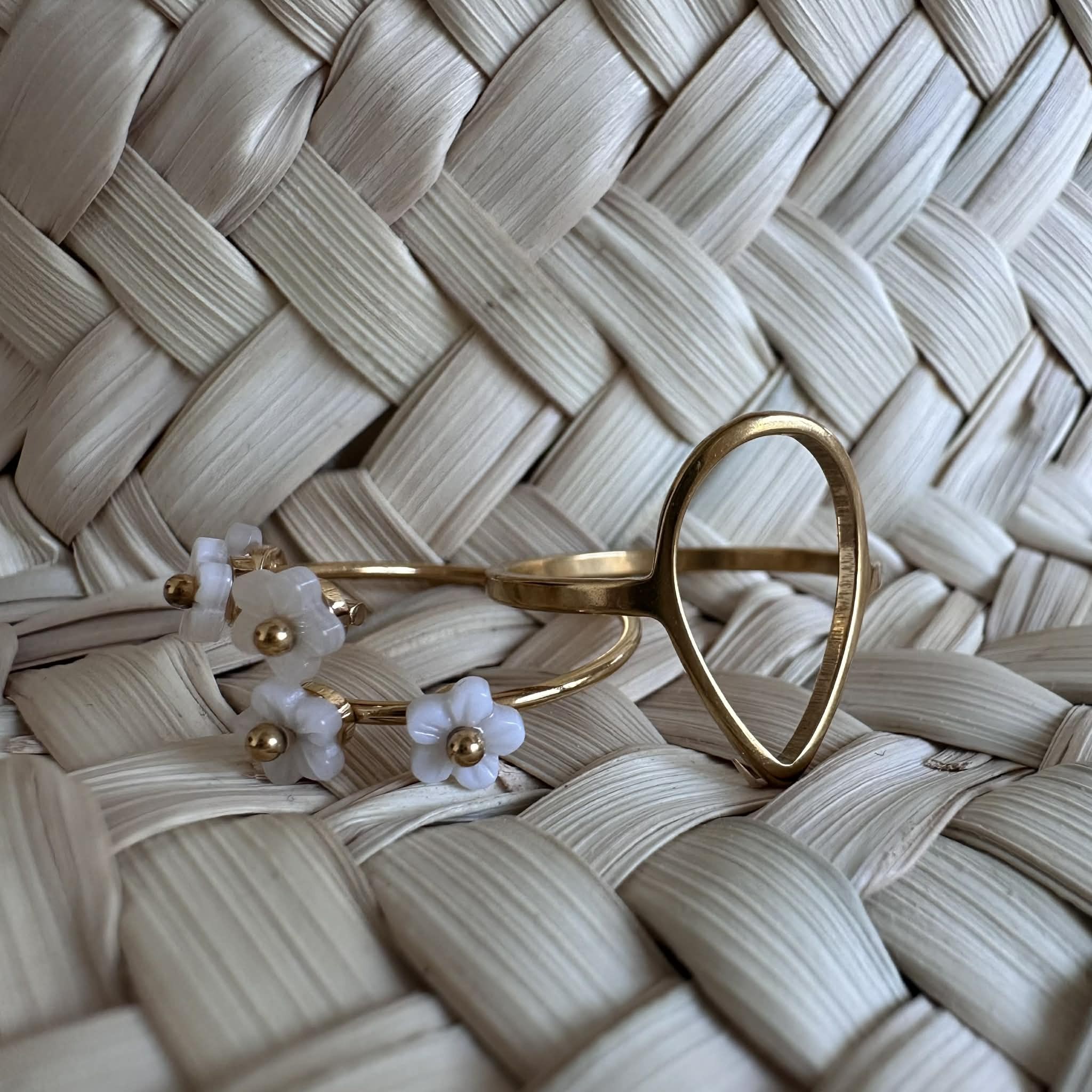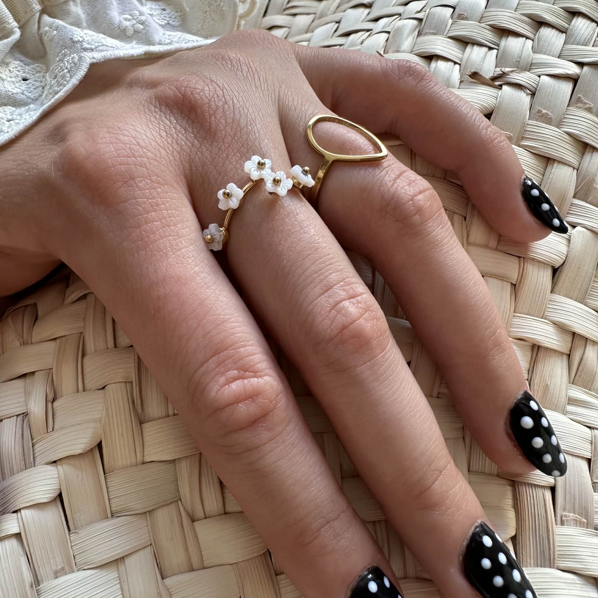 Une jolie bague délicate en acier inoxydable doré, décorée de petites fleurs en nacre, ajustable.