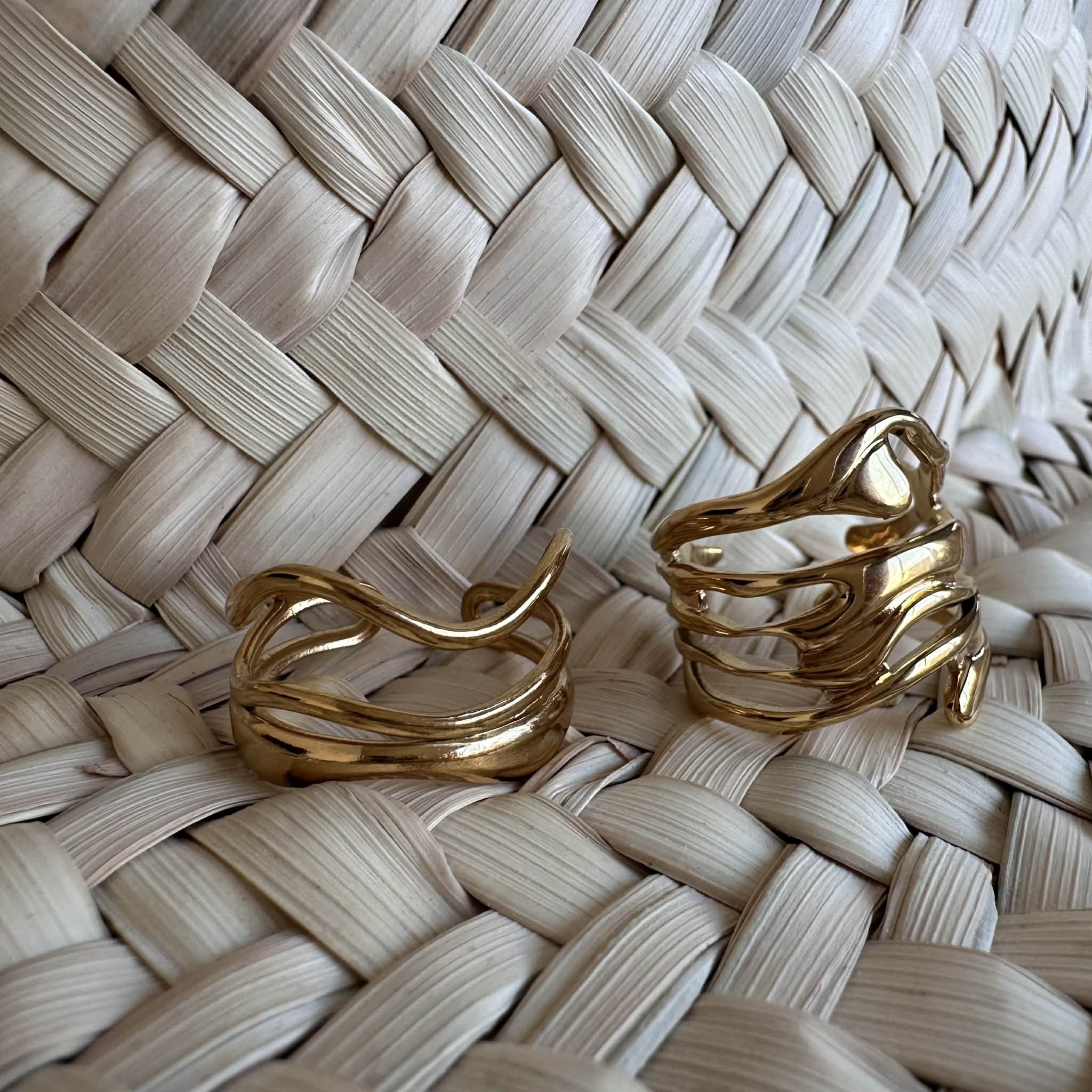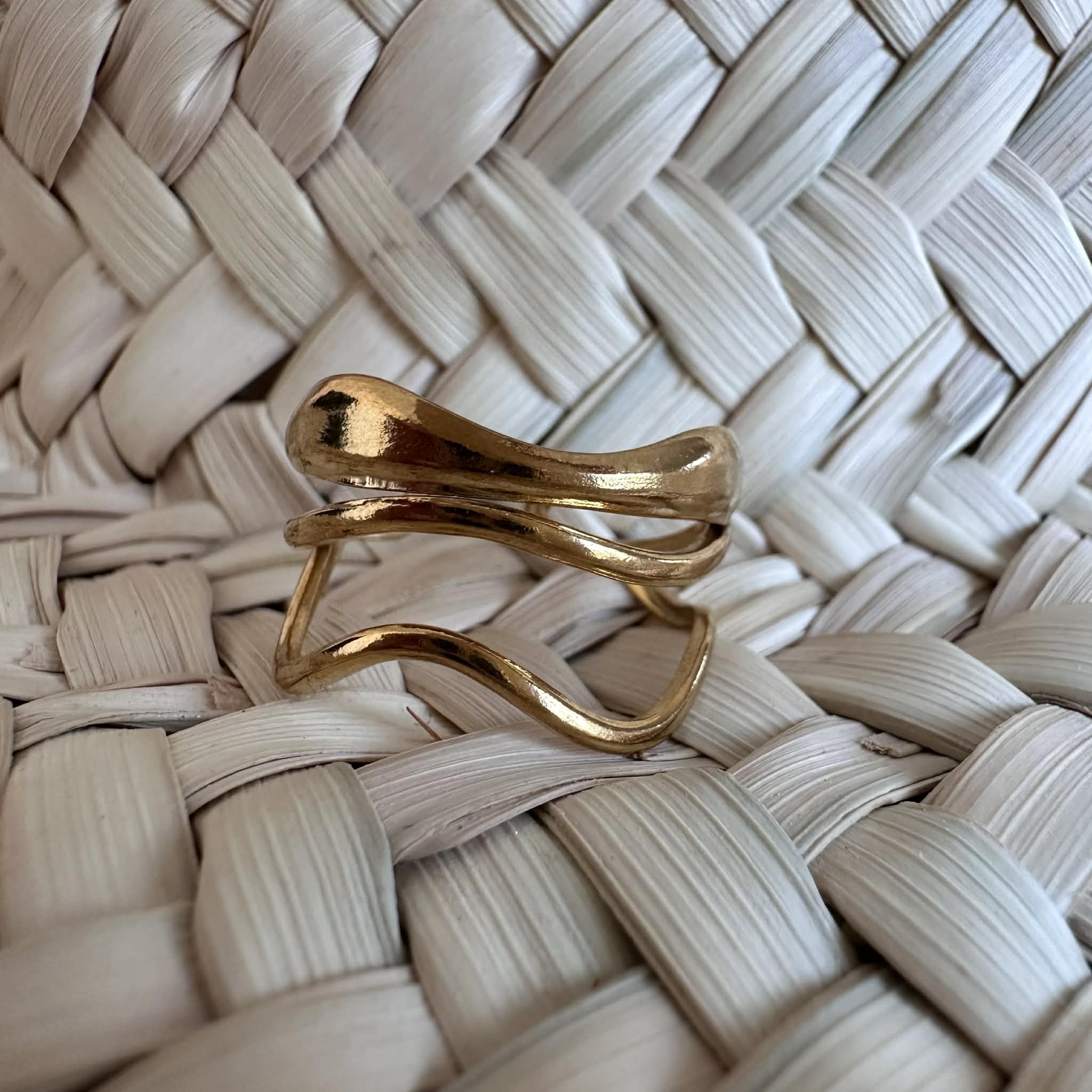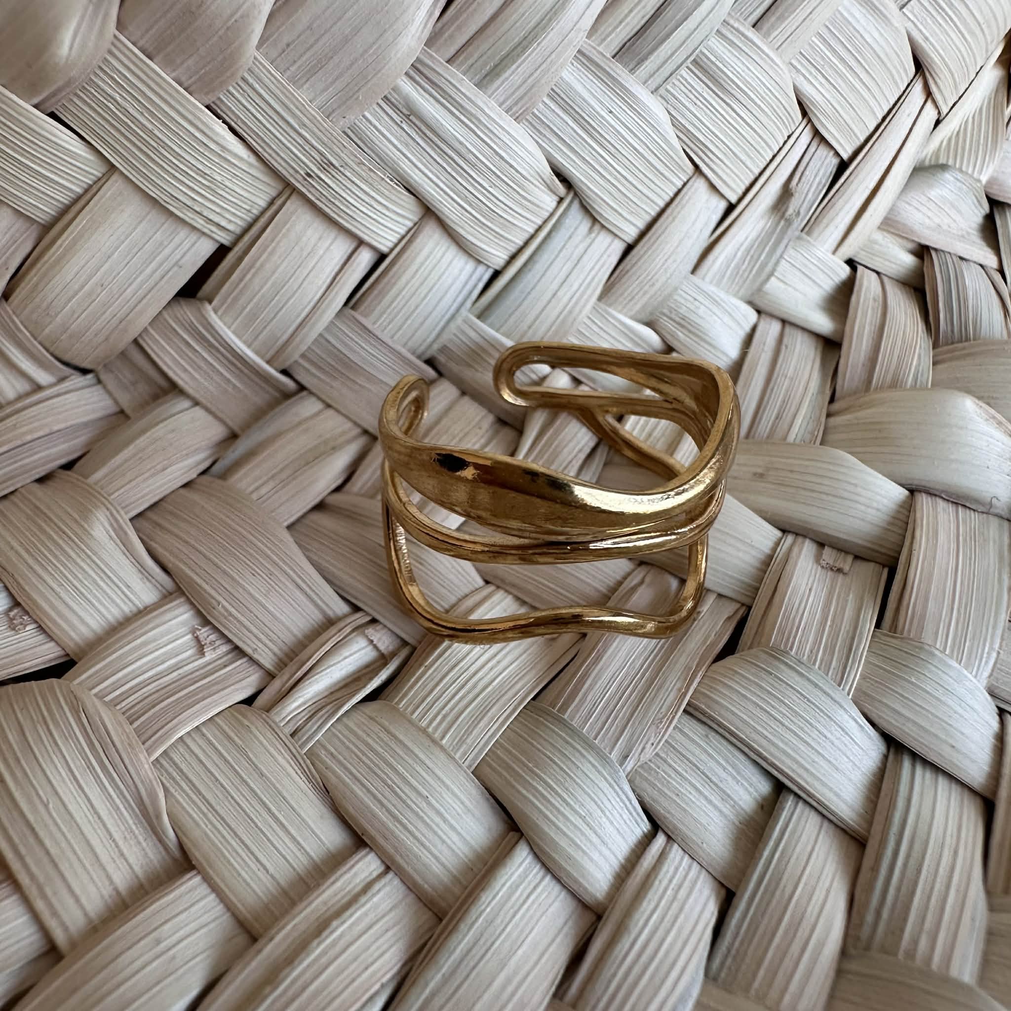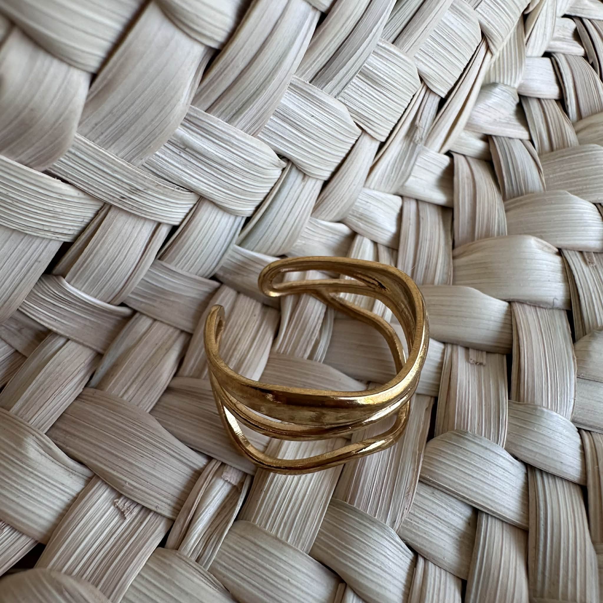 Une large bague ajourée trois rangs, en acier inoxydable doré et ajustable.