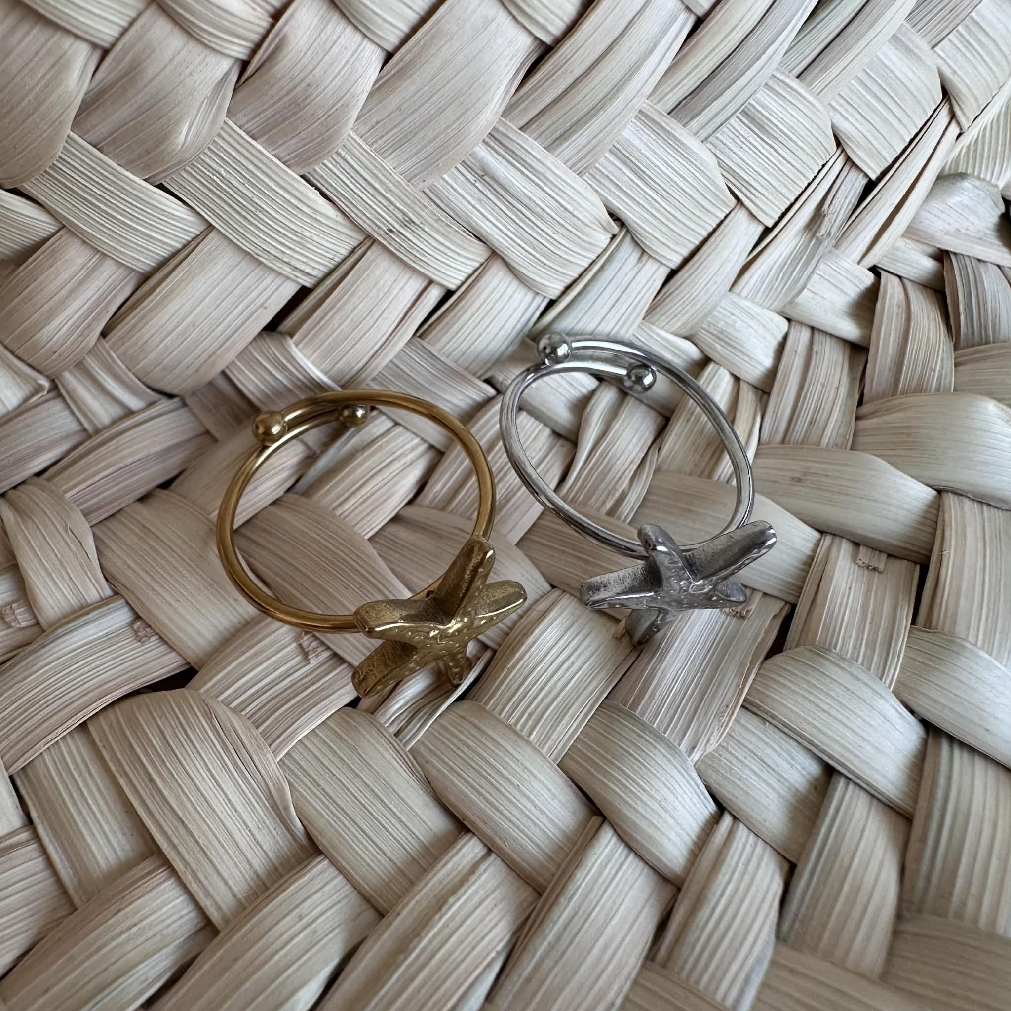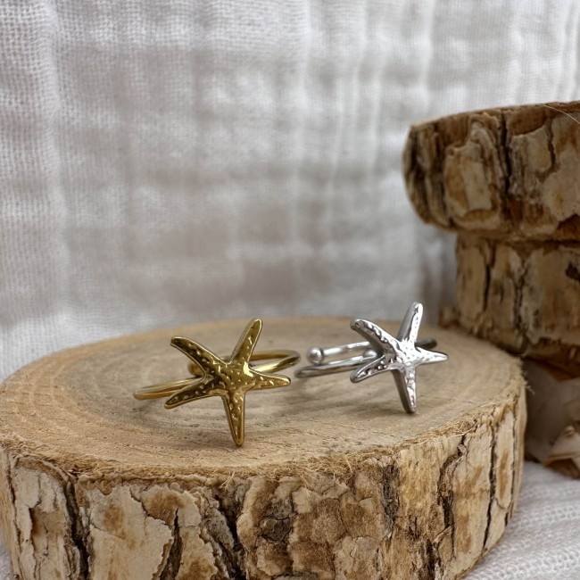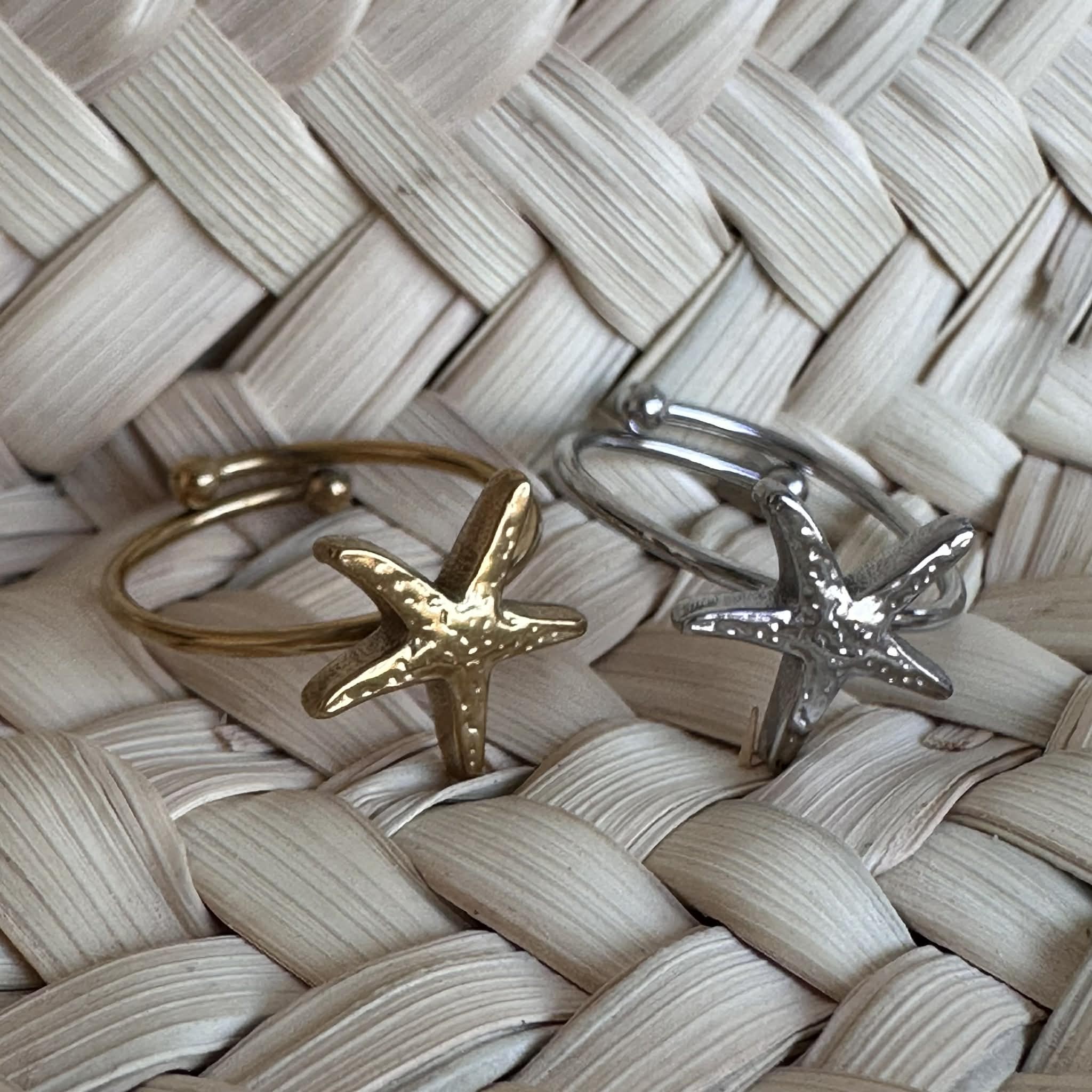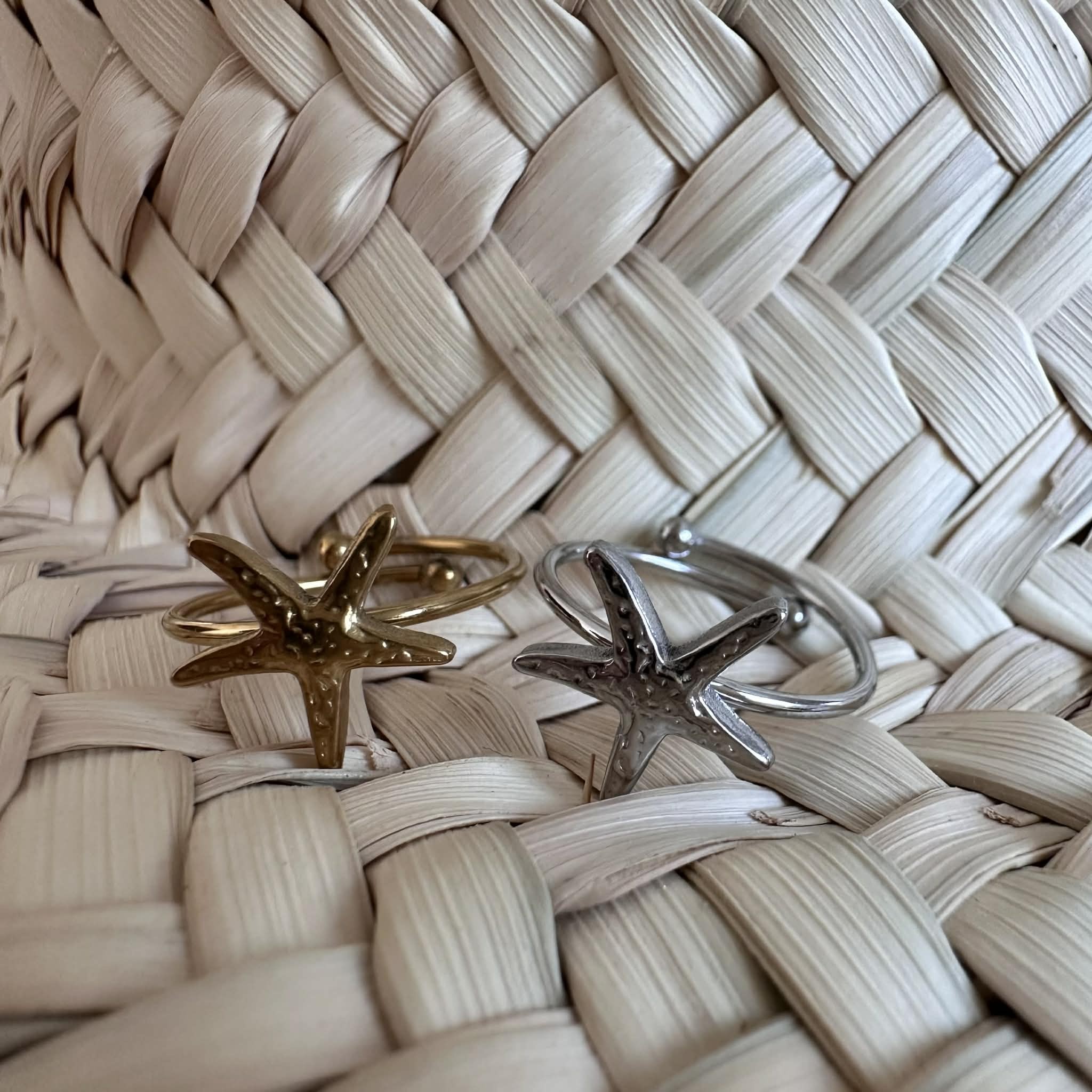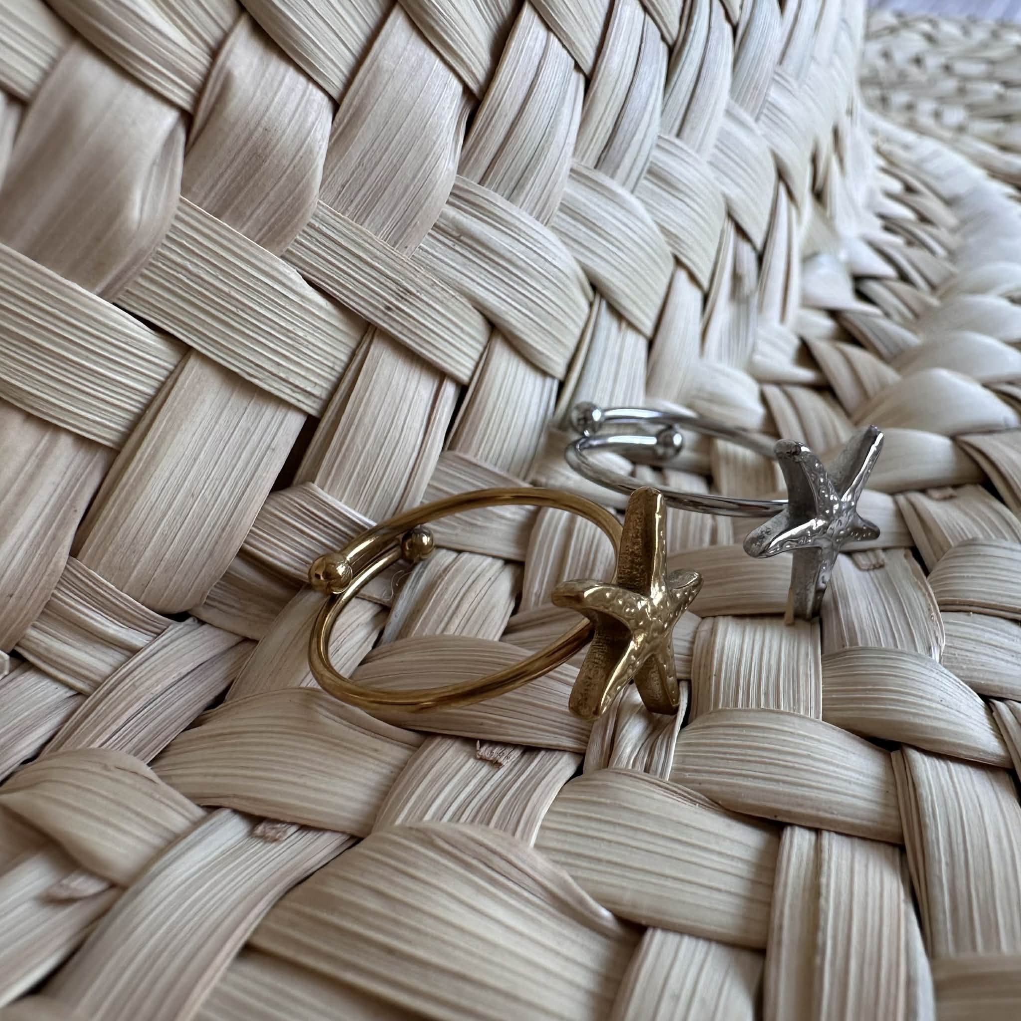 De fines bagues motif étoile de mer, en acier inoxydable doré ou argenté, ajustables.