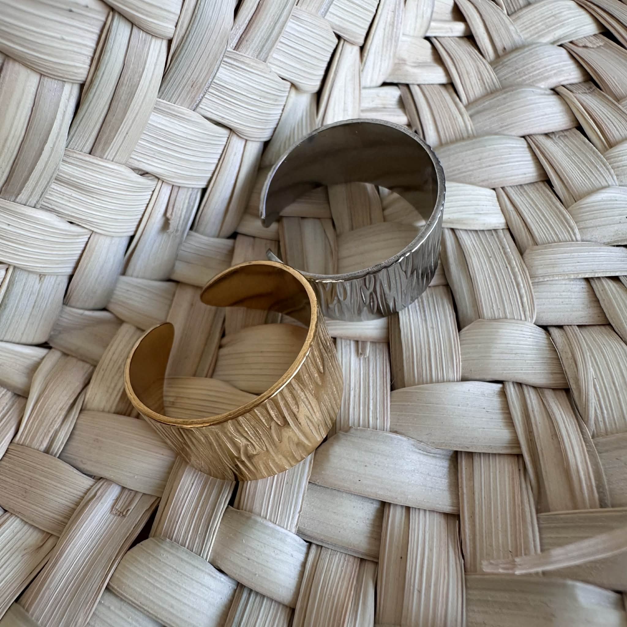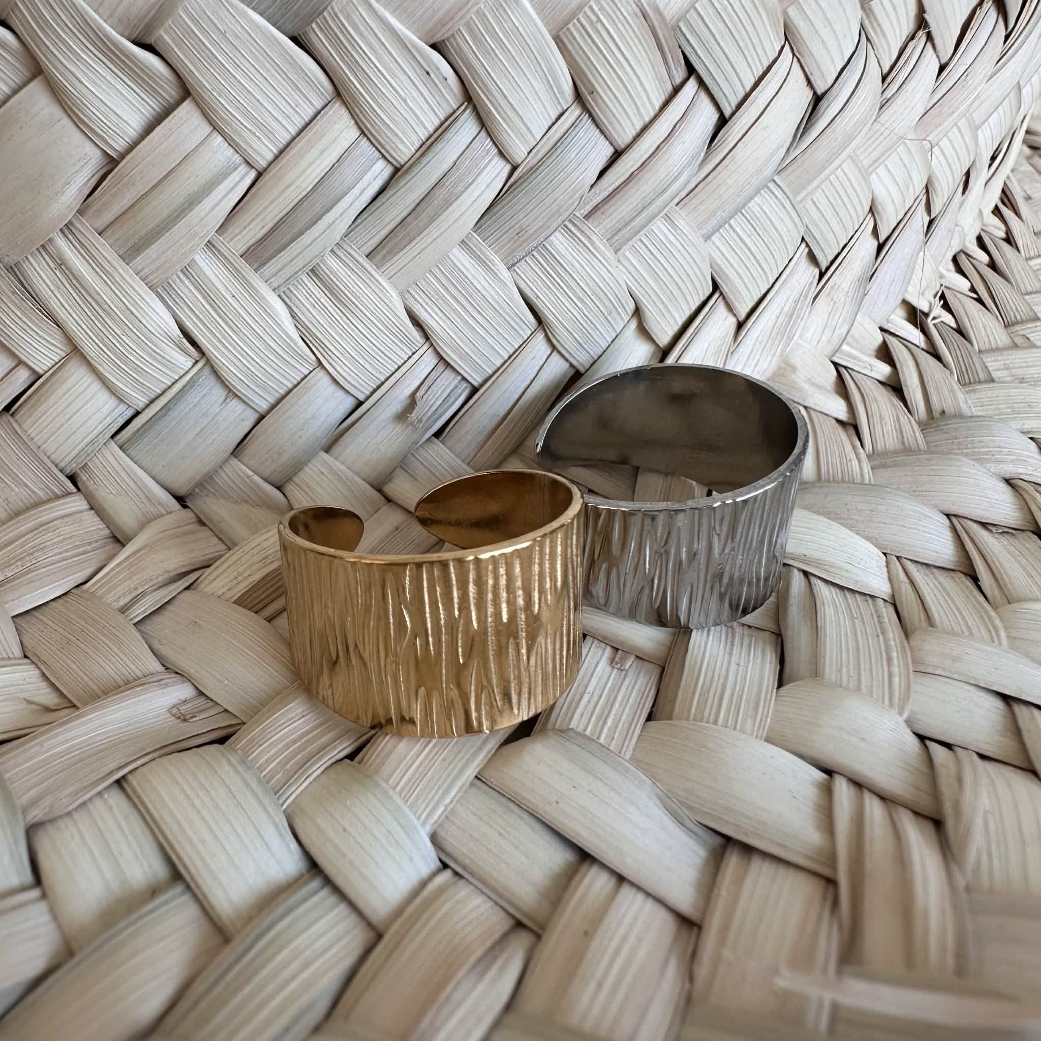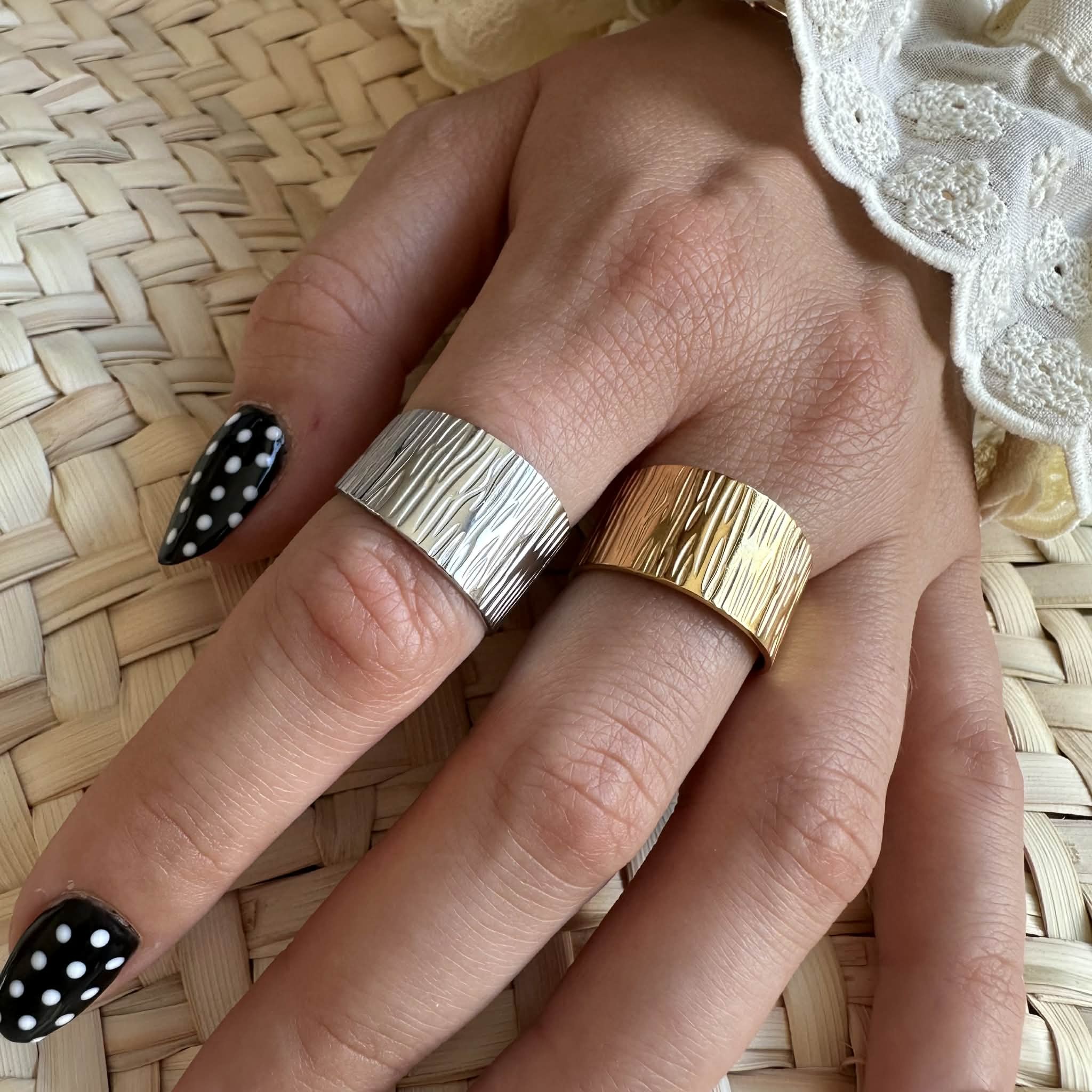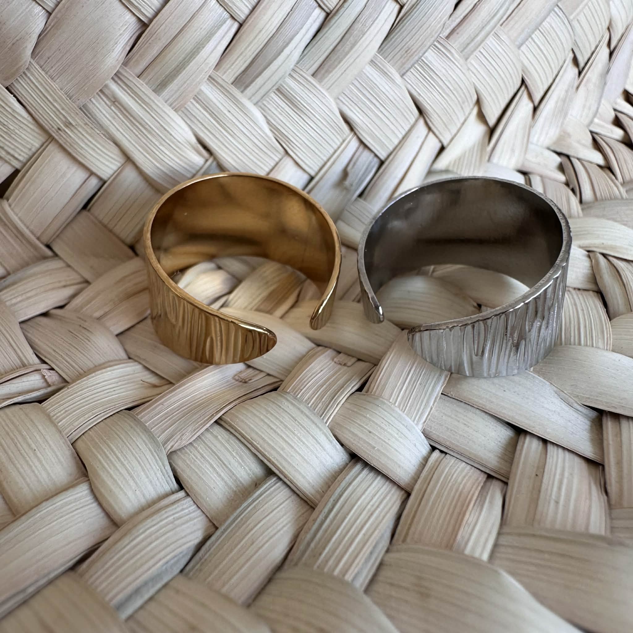 De larges bagues motif strié, en acier inoxydable doré ou argenté, ajustables.