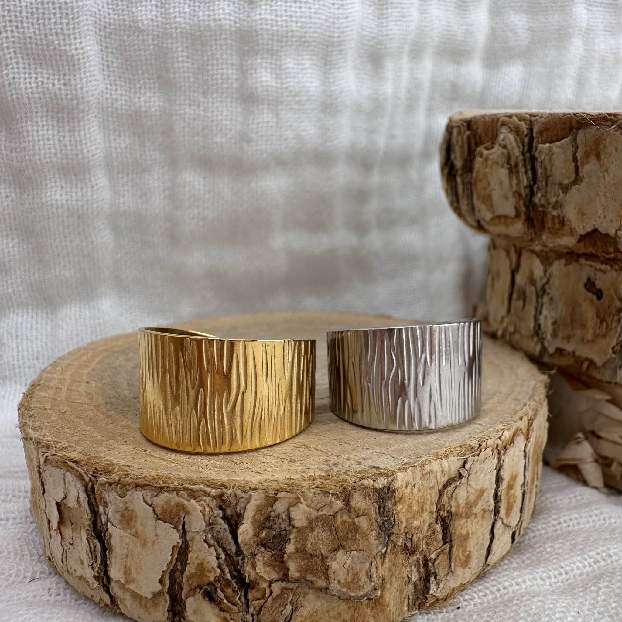 Bagues ajustables "Wood", acier inoxydable doré ou argenté