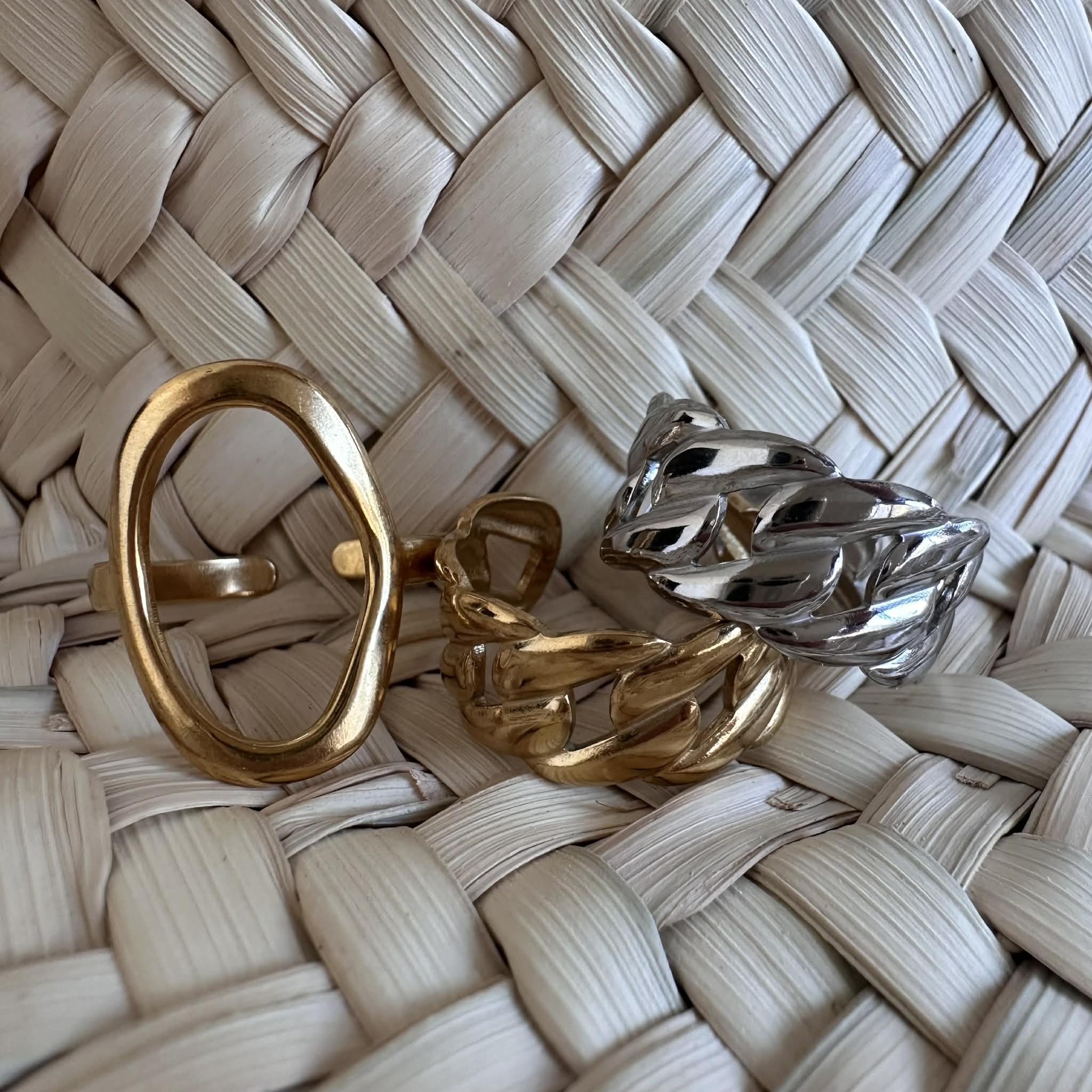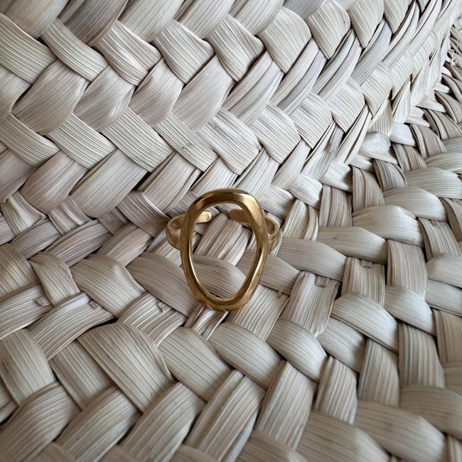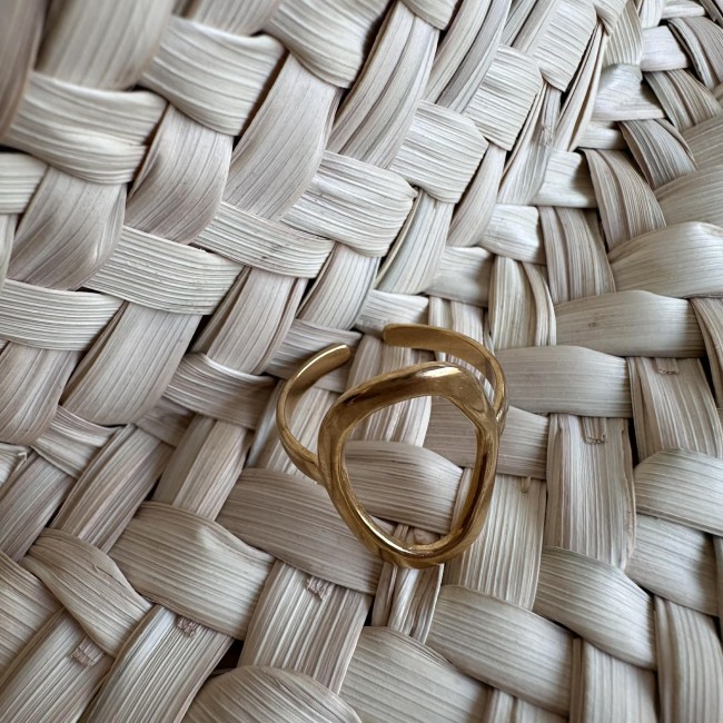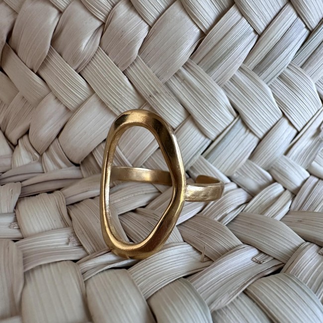 Une large bague ajourée ovale, en acier inoxydable doré et ajustable.