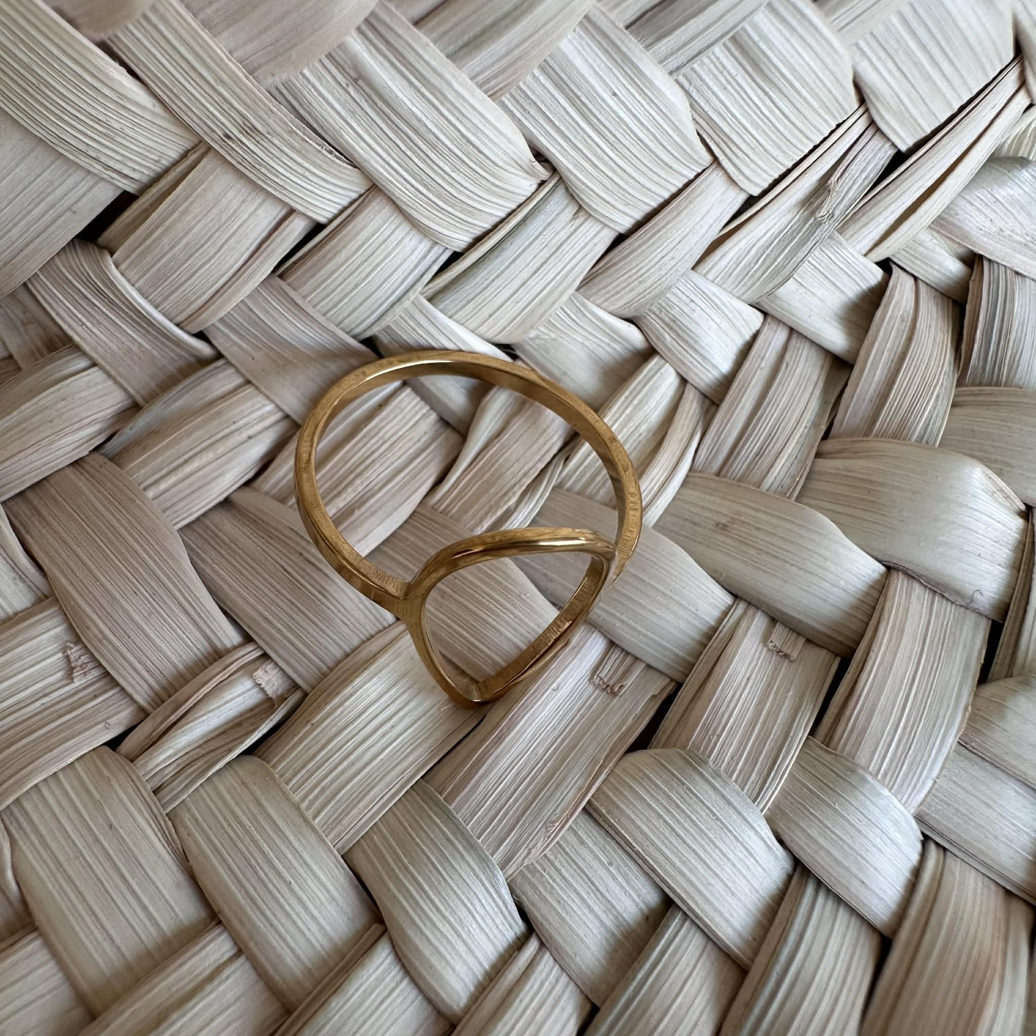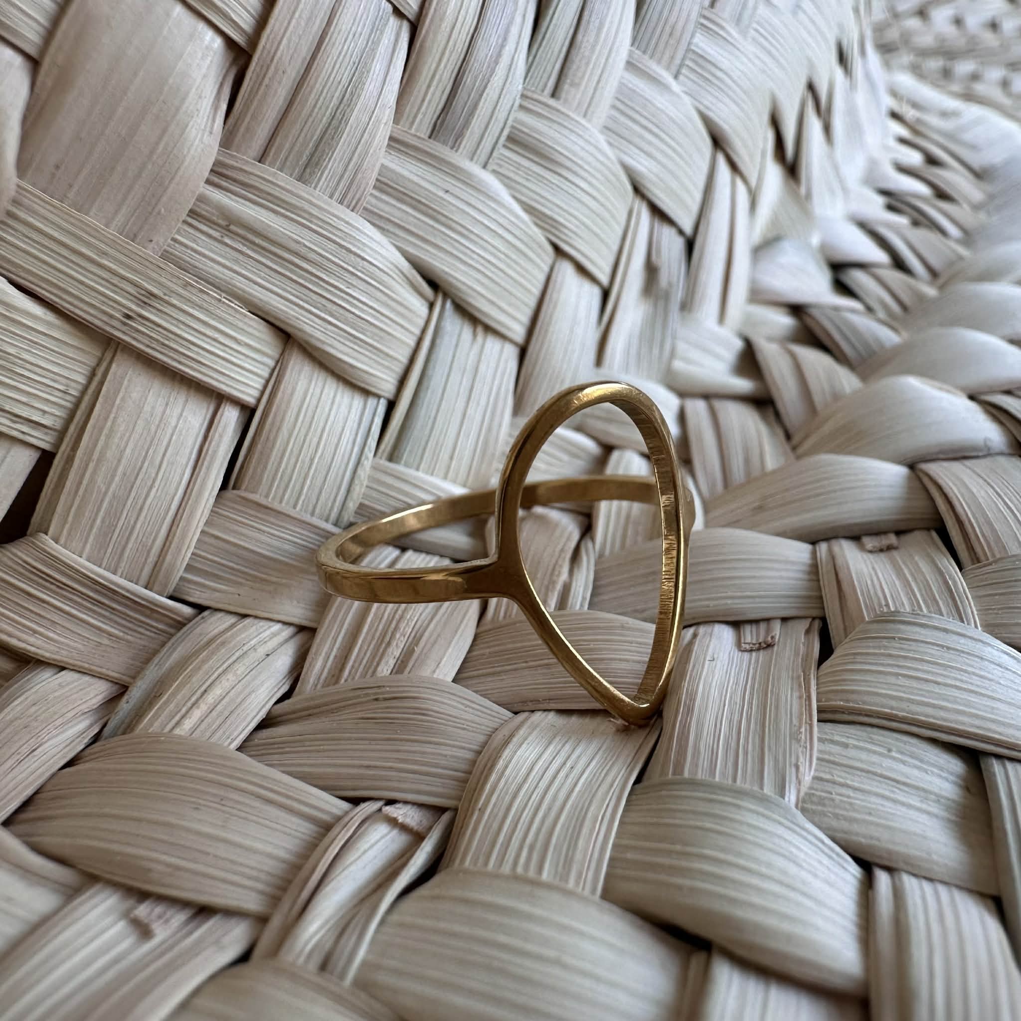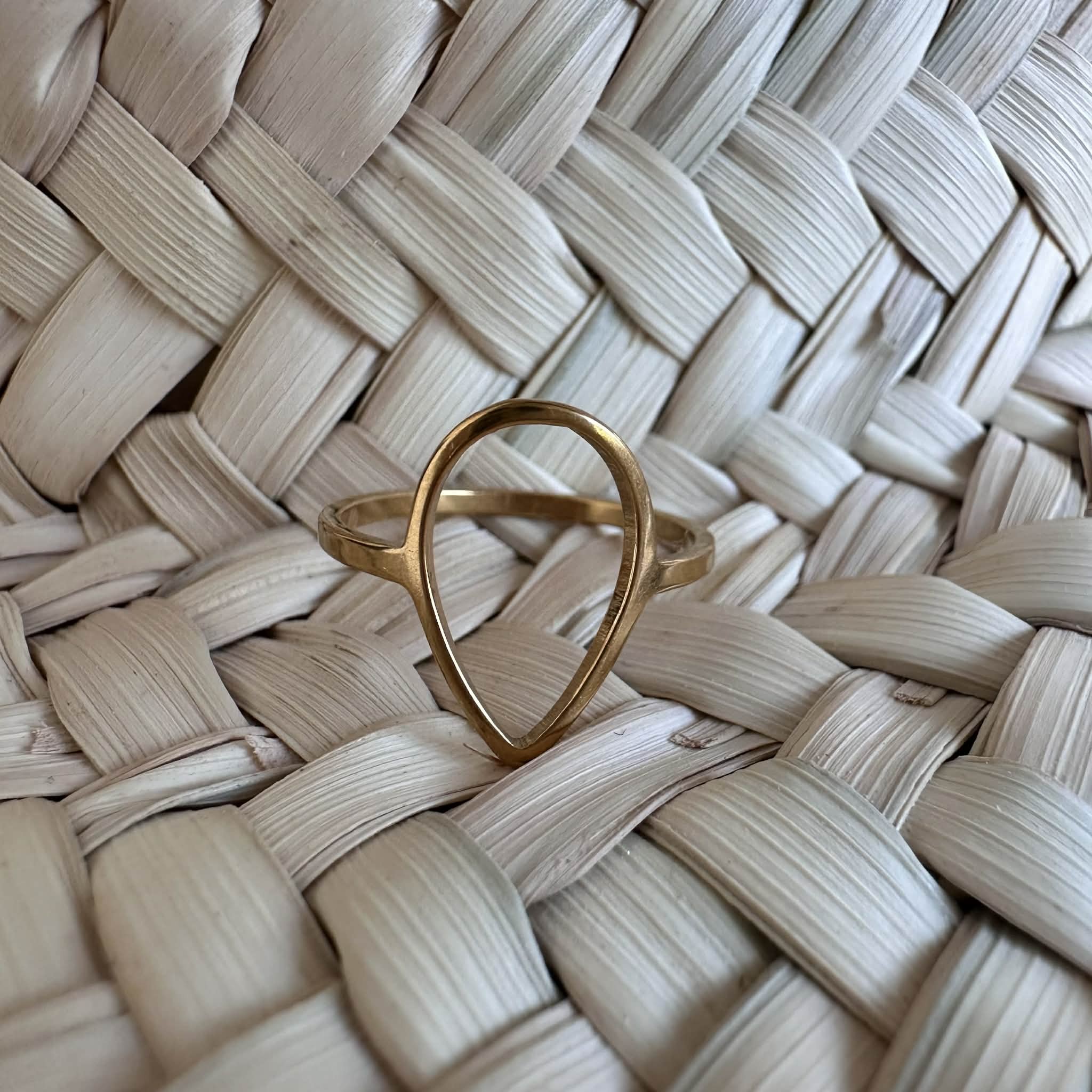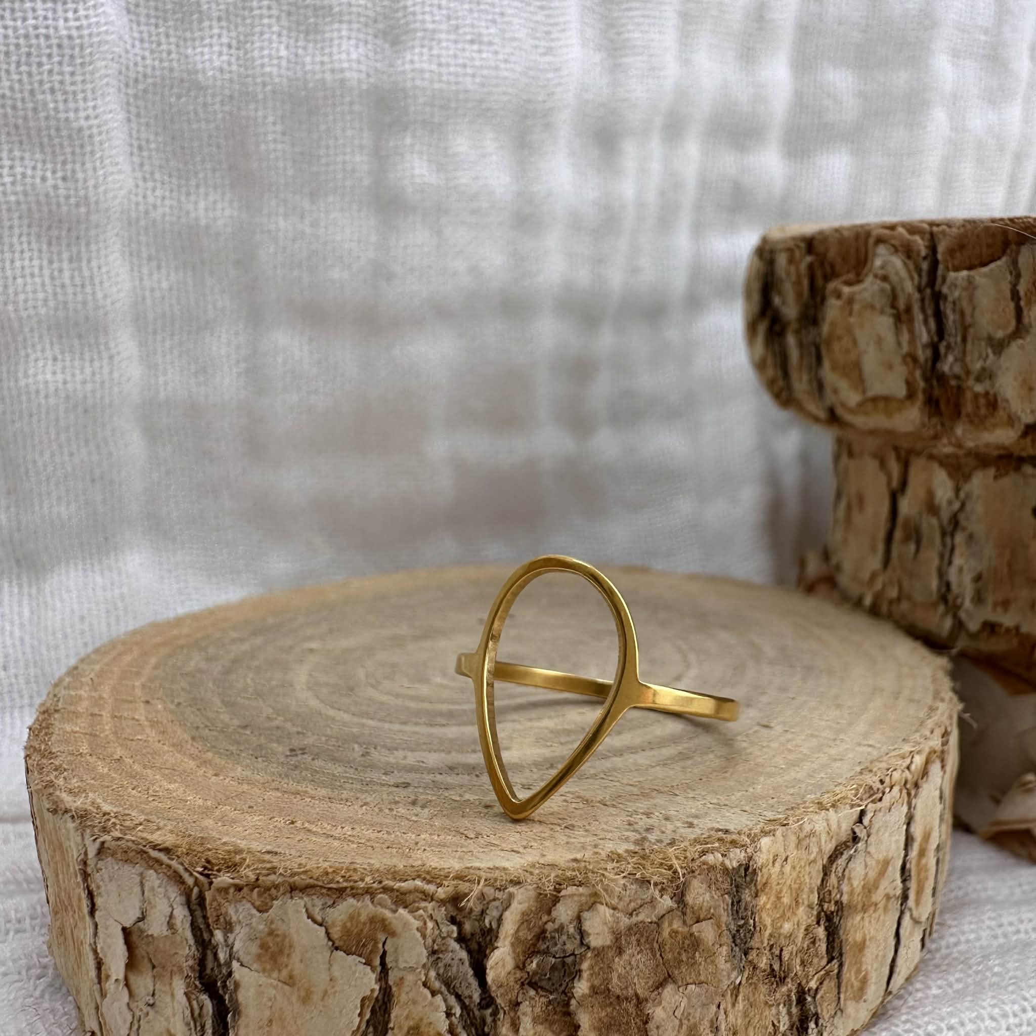 Une fine bague ajourée en forme de goutte, en acier inoxydable doré.